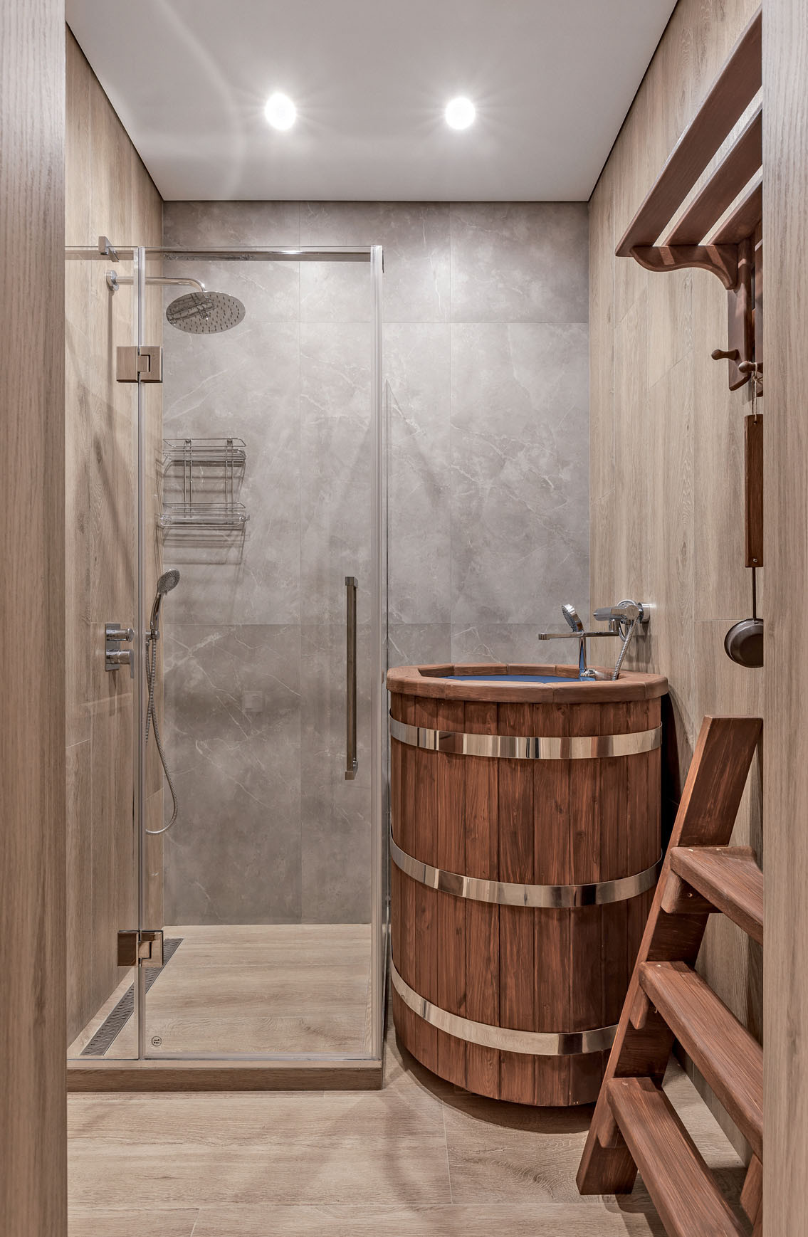 Хозяева вместе с авторами проекта творчески подошли к организации сауны и душевой в доме. Ведь баня, согласитесь, — это хобби, причём весьма полезное для здоровья
