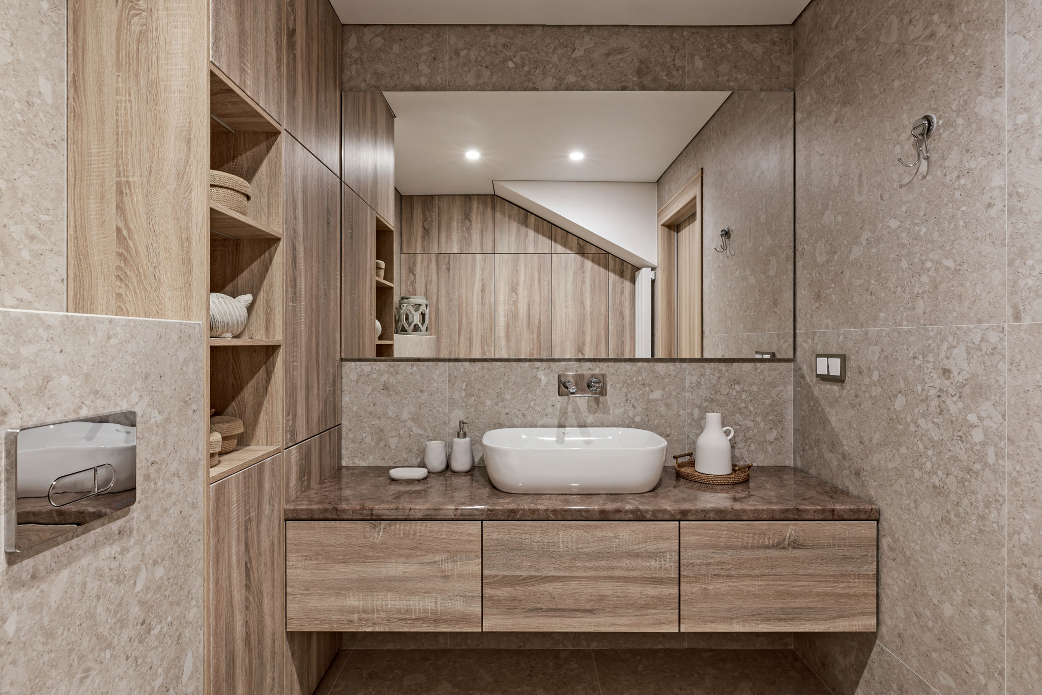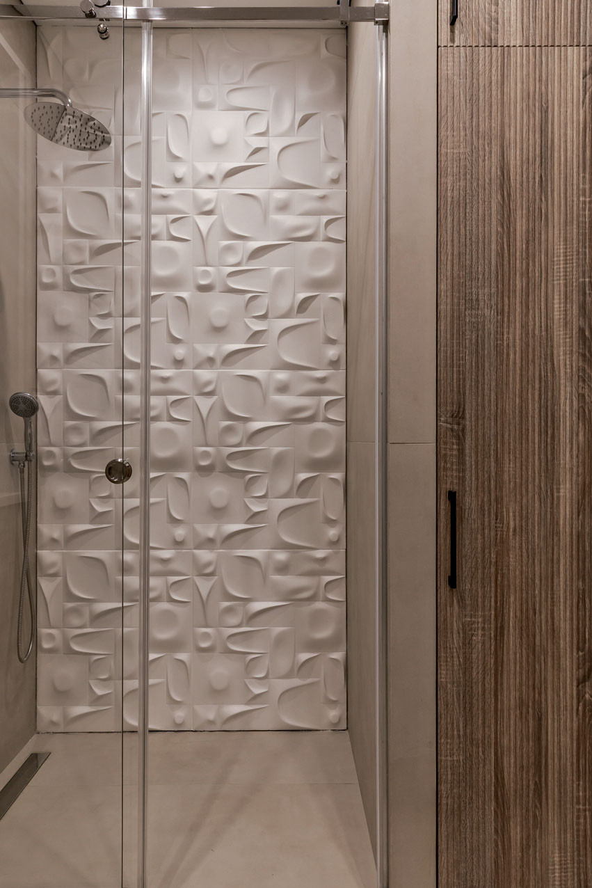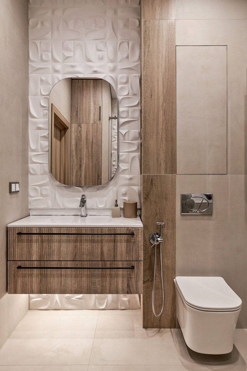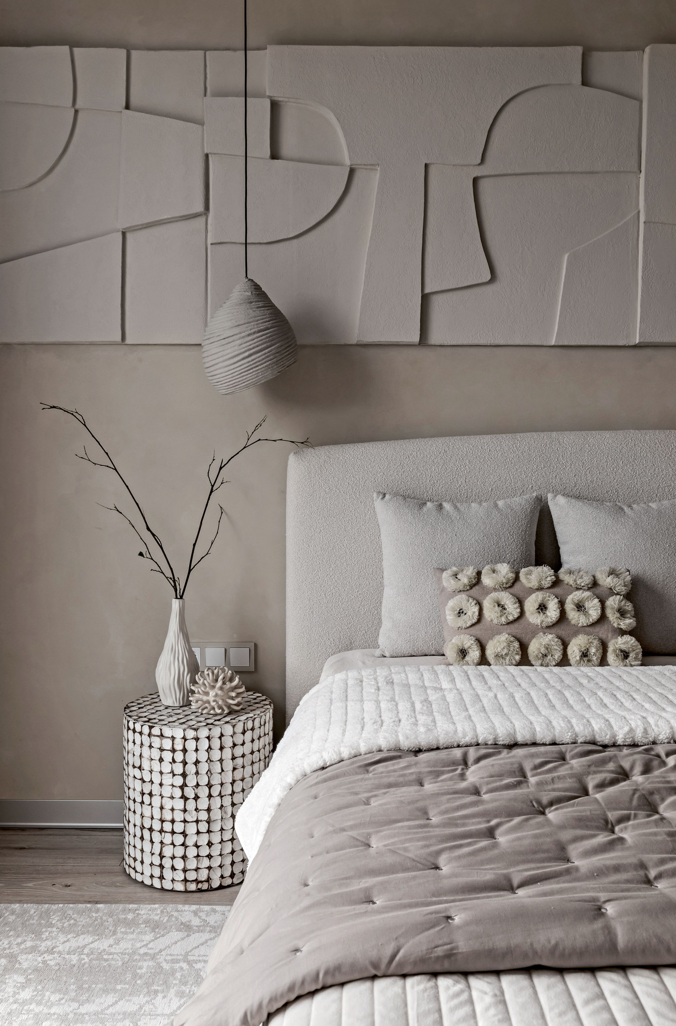 Визуальных впечатлений и эмоций в современный интерьер спальни и санузла добавляют декоративные панно и 3D-панели. Они созданы авторами проекта и мастерами дизайн-студии