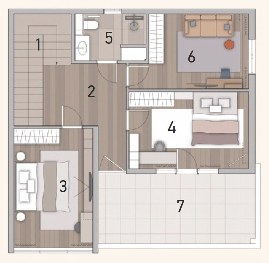 На втором этаже расположены изолированные друг от друга приватные комнаты членов семьи, кабинет, который периодически превращается в гостевую, а также просторный санузел. Двери всех помещений выходят в холл около лестницы. Небольшой коридор из него ведёт на открытую террасу.