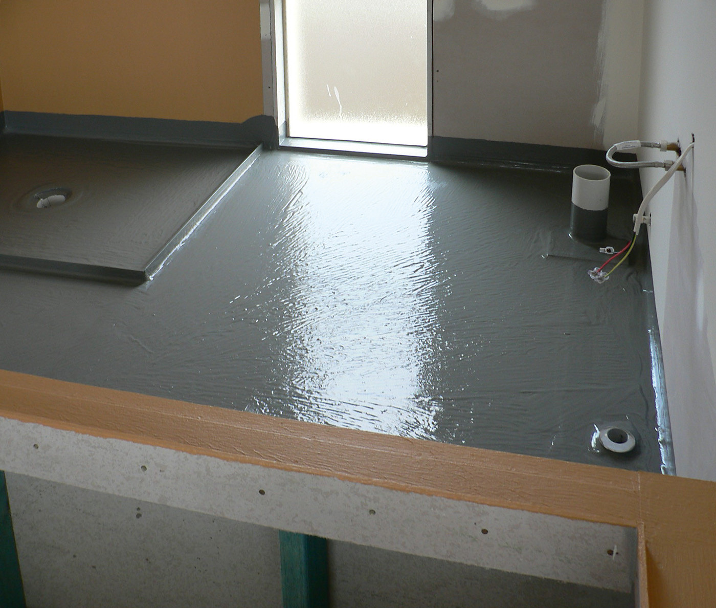 К устройству пола квартирного санузла приступают после возведения перегородок. Первый этап работ — гидроизоляция перекрытия.