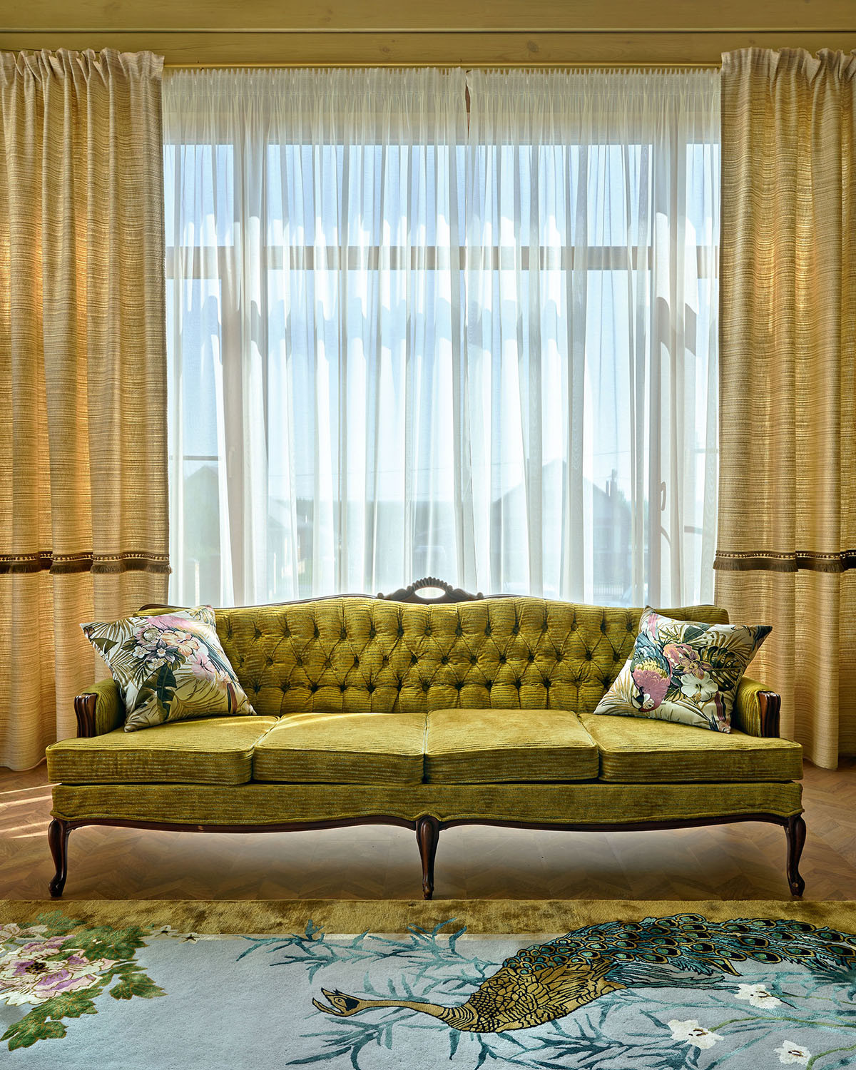 Интерьер этого гостевого дома в Нижегородской области — эффектная декораторская работа, яркая иллюстрация к поговорке «дизайн на кончиках пальцев». Словно припудренные природные оттенки, винтажная мебель и аксессуары, ковры с природными мотивами, текстиль, посуда — сложно представить, но все детали этого пространства Ольга Погосян подбирала постепенно, предмет за предметом. А начался интерьер с винтажного испанского буфета, который во всех смыслах стал «вещью номер один».