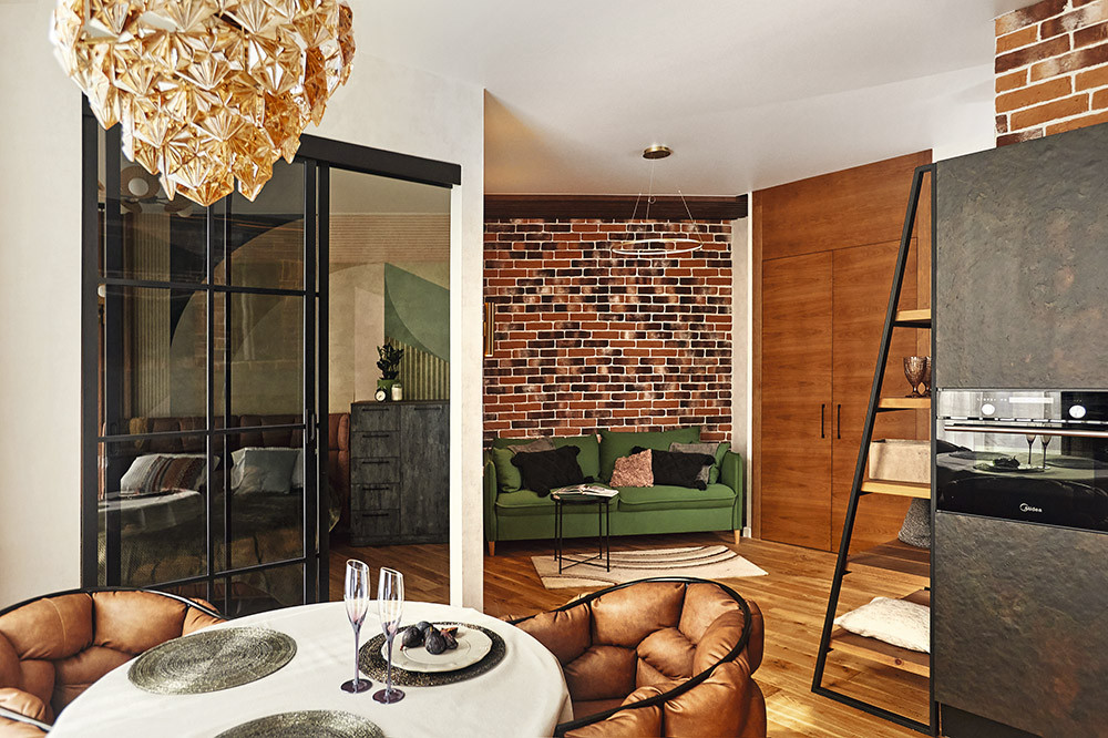 Дизайн. Кирпичные стены и лаконичная обстановка, обязательные для настоящего лофта, дополнены отделочными деталями из дерева и камня, привносящими в интерьер природную гармонию. Общую стилистическую идею интерьера поддерживают обои насыщенных оттенков: от коричневого до охры — и оригинально оформленная стена с деревянными рейками и геометрическим декором в спальне.
