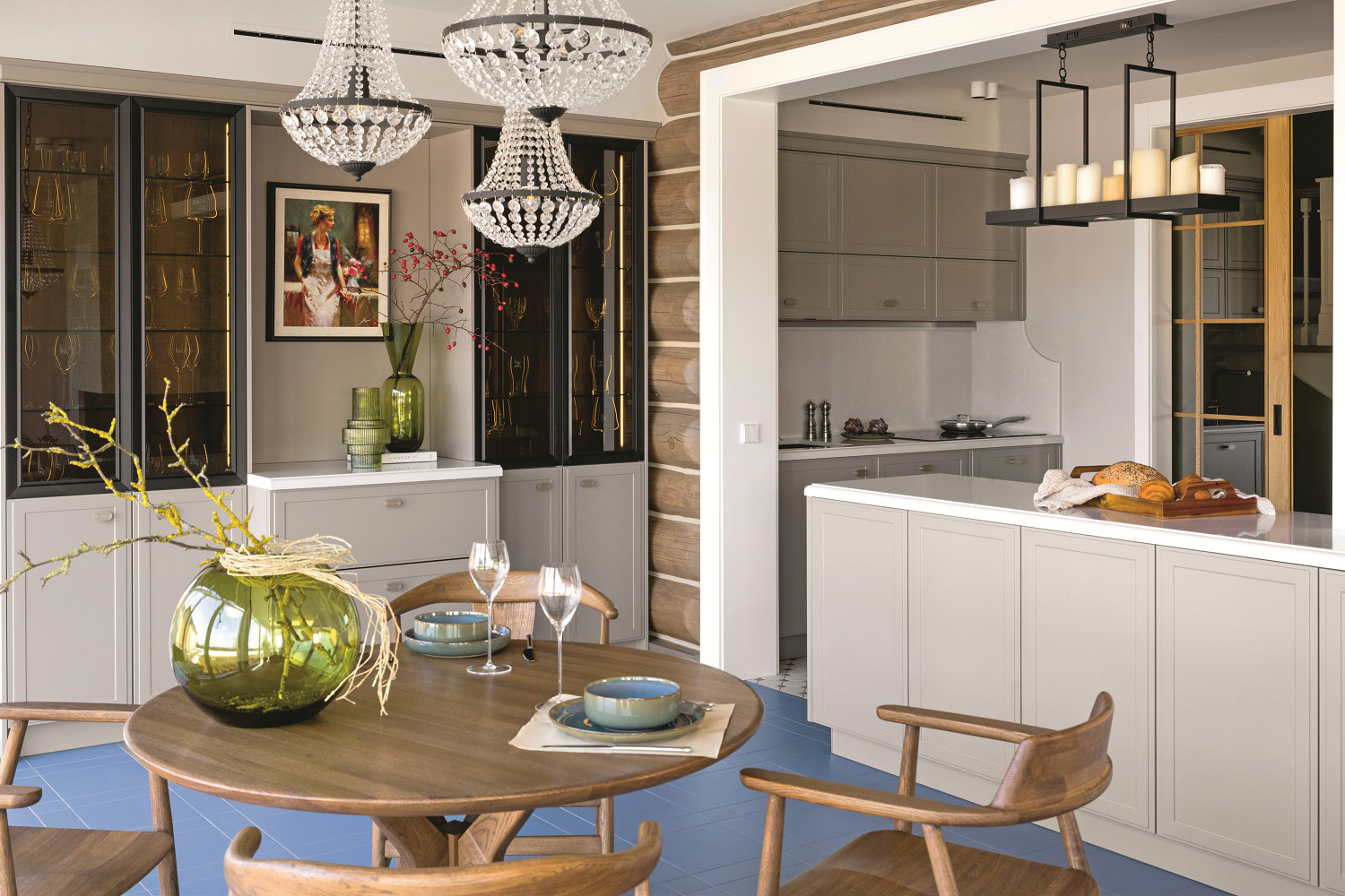 Стены из рубленого бревна — дань традициям, в то время как панорамное остекление и элегантная обстановка говорят о современном образе жизни. Баланс старого и нового в доме получился идеальным, как кристаллическая решётка, определяющая геометрически выверенную форму