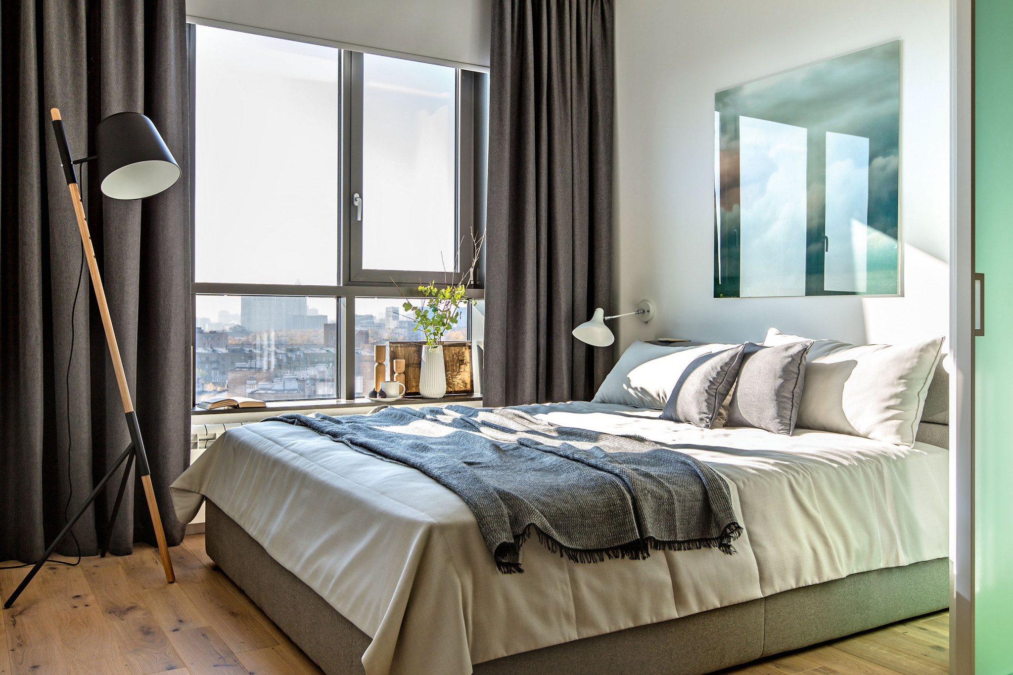 Перепланировка. Квартира в новостройке представляла собой бетонную коробку без внутренних перегородок, что позволило чётко спланировать расположение необходимых зон в малогабаритном пространстве. Справа от входа удалось выкроить место для гардеробной, напротив — разместить душевую. Остальные возведённые перегородки выполняют не только зонирующую функцию между приватной и общественной территорией, но и образуют ниши для встроенных шкафов. Балкон решили не присоединять, а утеплить и оборудовать конвектором.