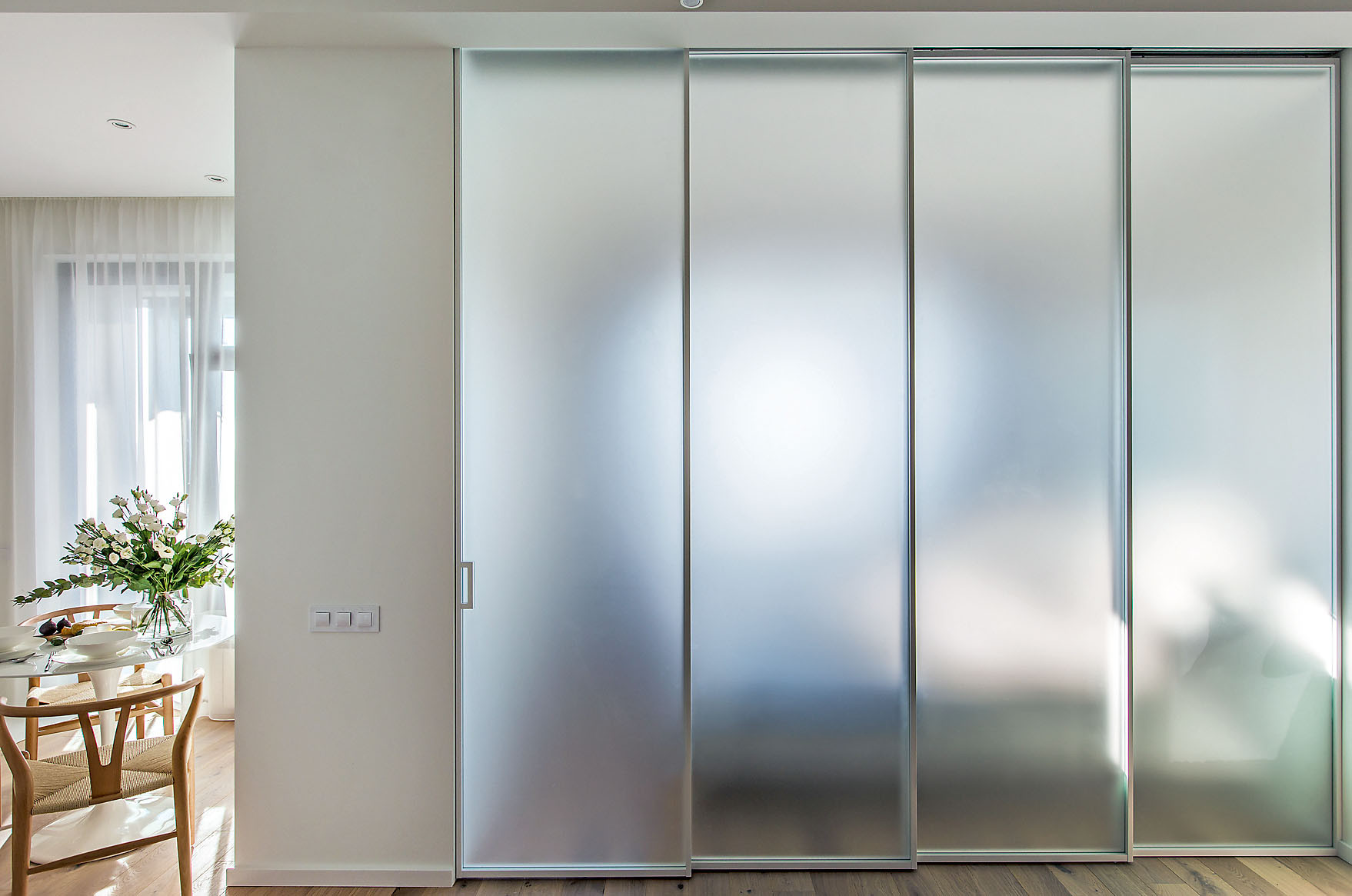Ремонт. Стяжка, которую выровняли в один уровень с порожком, заняла 10 см. Почти во всех помещениях уложили экологичную инженерную доску, а в душевой, рабочей зоне кухни и прихожей в качестве напольного покрытия выступил керамогранит. Потолки опустили только в зонах, где необходимо было проложить коммуникации: воздуховоды, пожарные датчики, трубы кондиционирования, а также спрятать карнизы для штор. Большинство стен окрасили белой моющейся краской, а часть поверхностей в зоне гостиной отделали панелями из шпона дуба. Окна были установлены застройщиком, но при сдаче дома обнаружились царапины, которые пришлось аккуратно заретушировать. Щитки смонтировали слева от входа и закрыли дверцами из специально изготовленных