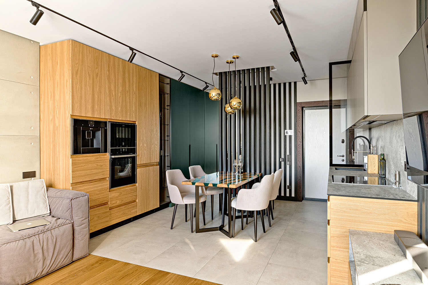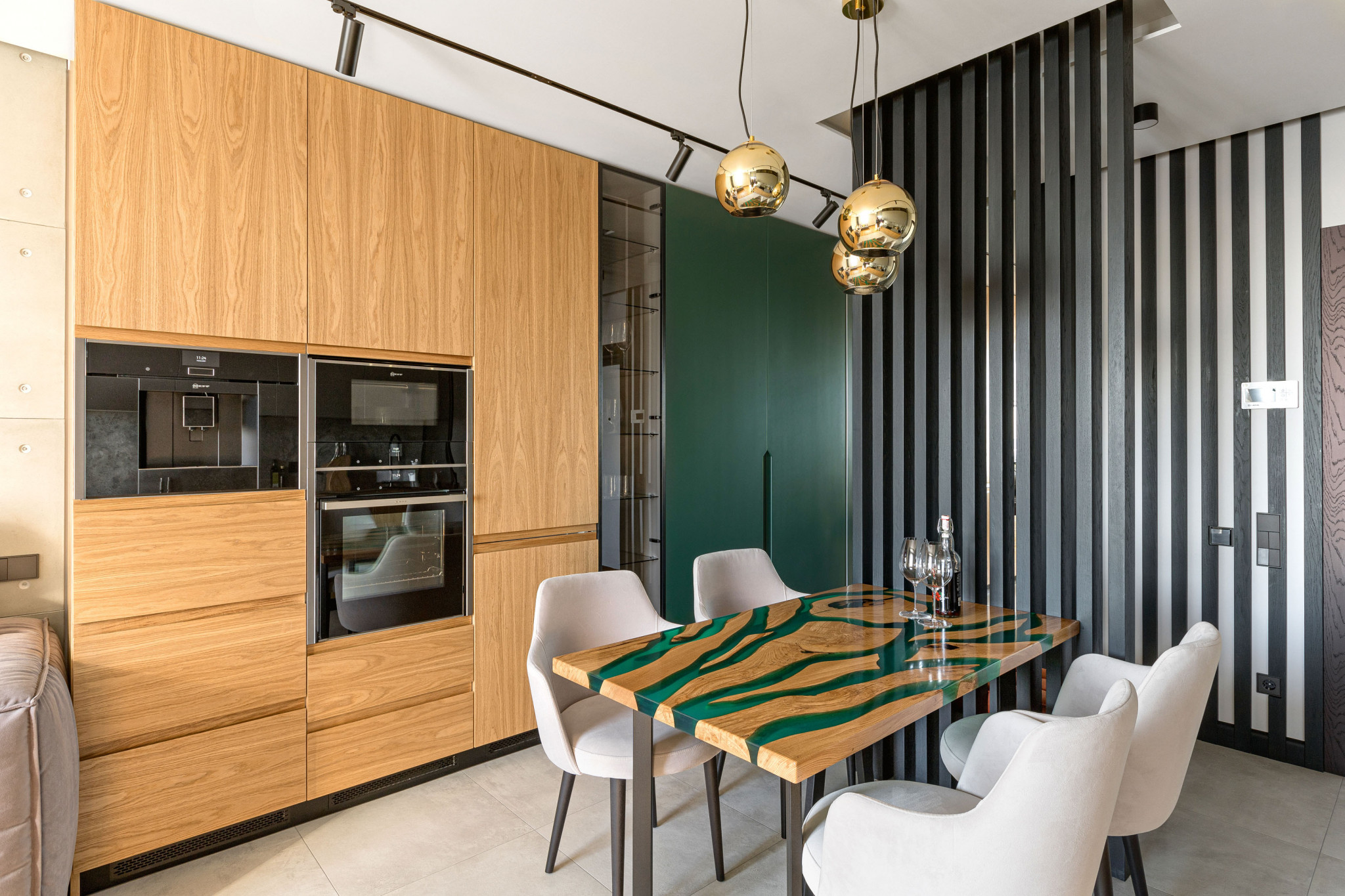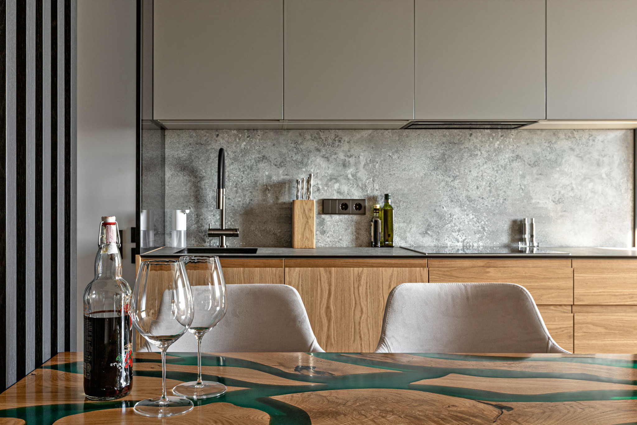 Оригинальным украшением кухни-гостиной является «стол-река», выполненный на заказ из натурального дерева. Именно такой дизайн был принципиально важен для клиента