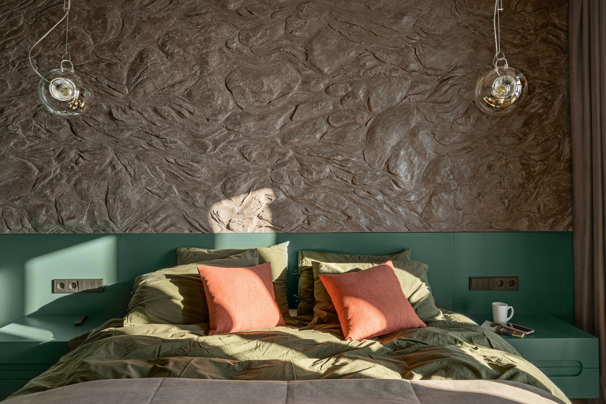 Несмотря на имитацию скальной породы — дань мужскому интерьеру — спальня смотрится уютно благодаря тёплым цветовым акцентам текстиля