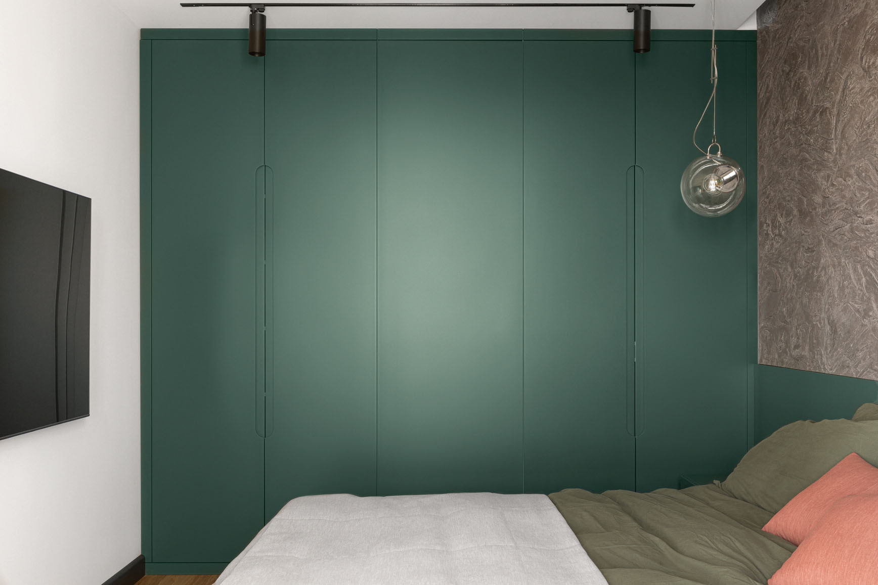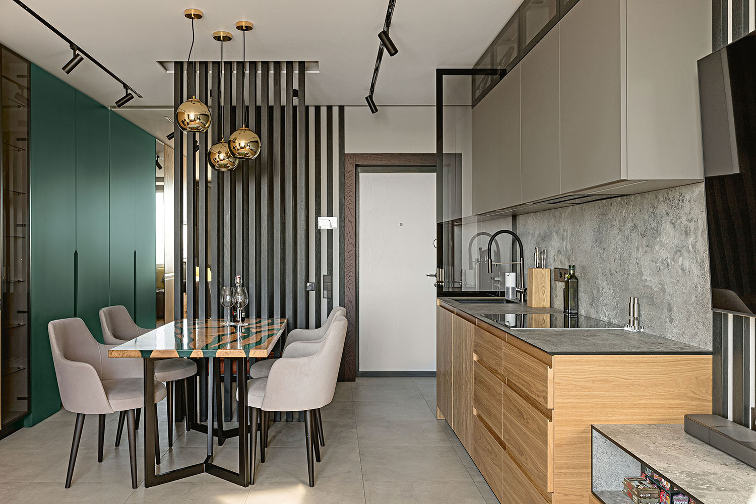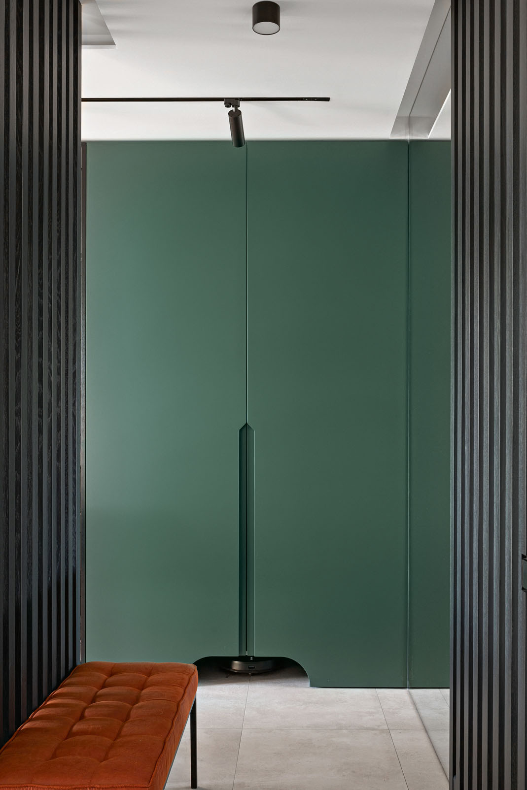 Самым приятным в работе над этим проектом было стопроцентное доверие клиента. В нашем случае требовался архитектурный интерьер, то есть спроектированный за счёт пространства, объёмов и форм. Для него был не нужен декор. Именно поэтому в квартире нет ни одной вазы, ни одной картины. Ничего не принесено специально для украшения, всё уже «вплетено». Заказчик и не собирался обживать пространство добавлением или демонстрацией каких-то личных вещей, и всё сложилось наилучшим образом. Мы согласовали проект с первой визуализации и затем чётко ей следовали. Важно отметить, что во всей квартире доминирует один цвет, который комбинируется с другими оттенками и фактурами и даёт интересные решения. Глухой зелёный и дерево для кухни-гостиной, глухой зелёный и пастельные тона для спальни, глухой зелёный и терракот в санузле и прихожей.