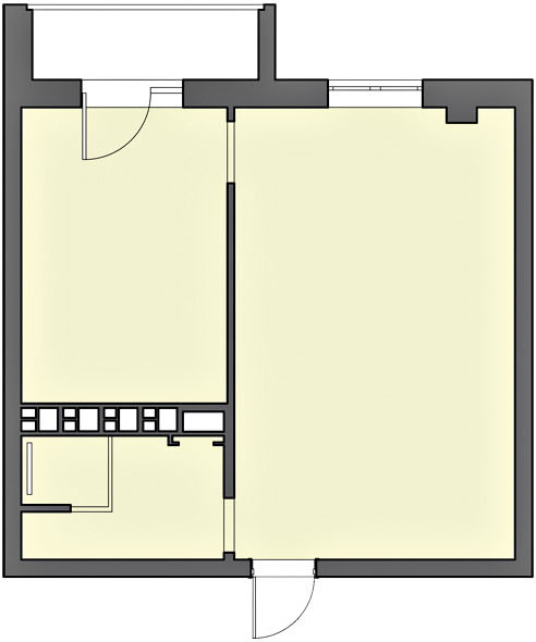 Перепланировка. Основные функциональные задачи, которые предстояло решить в данном интерьере, сводились к удобству проведения досуга с друзьями за настольными играми и плэйстэйшен, а также к необходимости создания отдельной спальни. Конфигурация квартиры позволила реализовать задуманное оптимальным образом: выделить кухню-гостиную с частично отгороженной входной зоной и отдельную спальню. Место санузла было определено расположением стояков и окон. Кроме того, в присоединённой лоджии удалось сделать полноценный рабочий кабинет: её утеплили и среди прочего оконный блок заменили на новый с коэффициентом сопротивления теплопередаче, близким к единице.