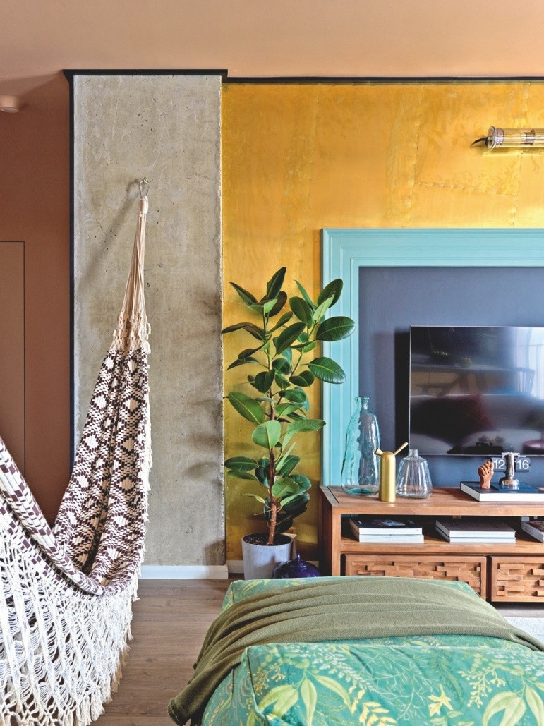 Интерьер, словно пазл, сложен из материалов и предметов совершенно разных стилей: экзотической этники, грубого лофта и лаконичного минимализма; например, брутальный стол-верстак соседствует с мягким бескаркасным диваном, а латунная обшивка — с тропическим принтом на обивке