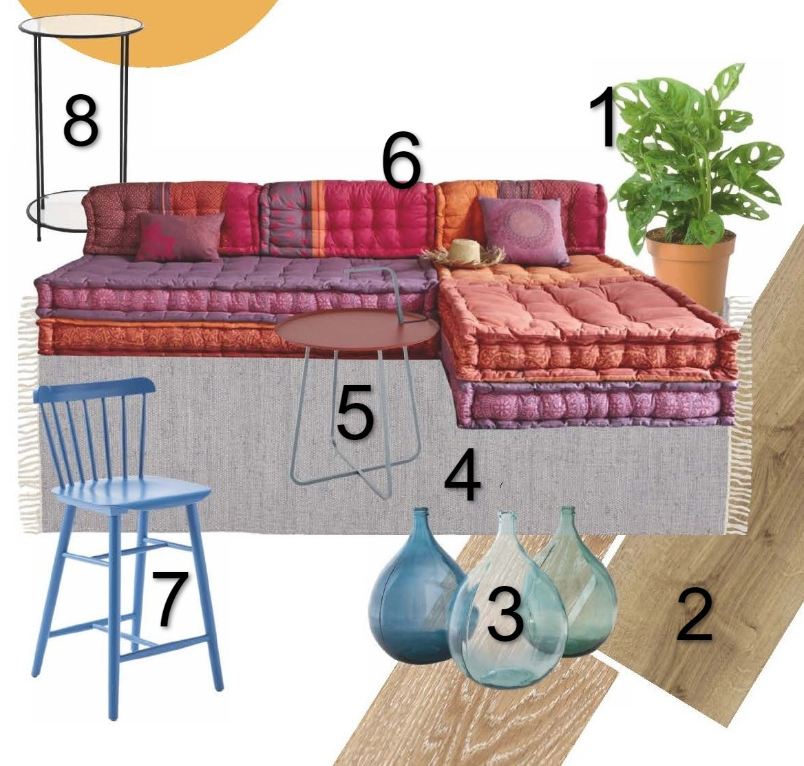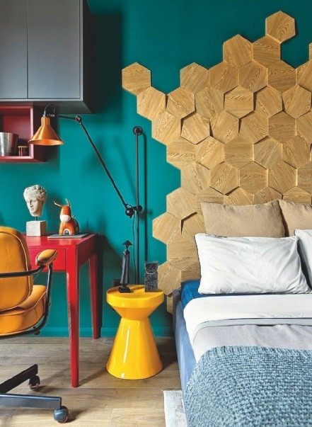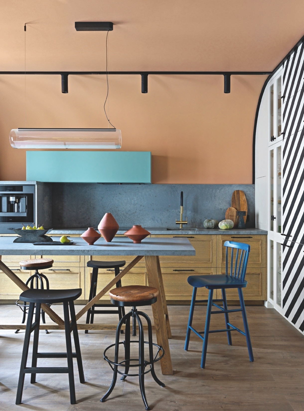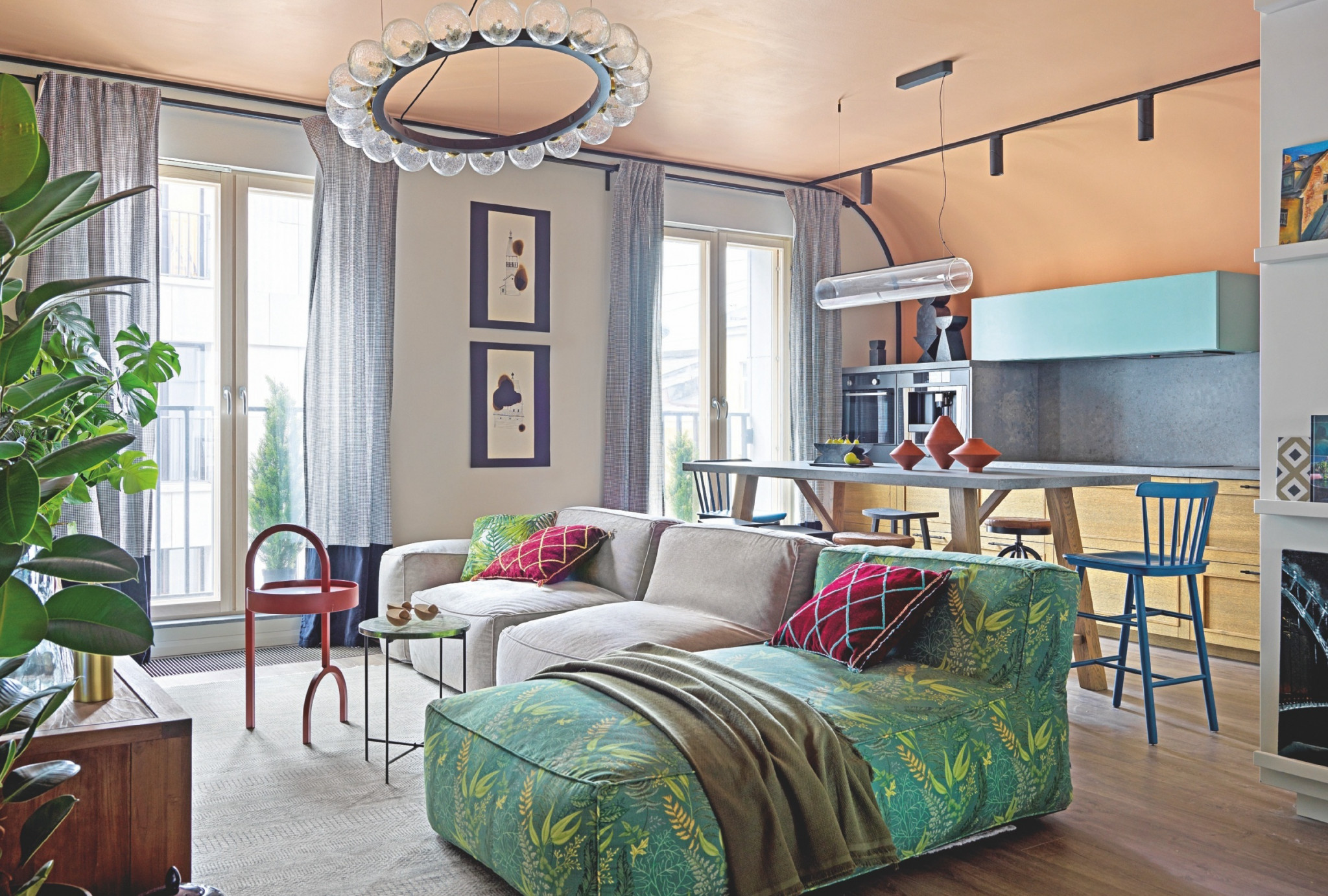 Яркостью, живостью и динамичностью интерьер обязан дерзкой колористической палитре, а ещё эклектичному собранию отделочных материалов, светильников, предметов обстановки и декора.
