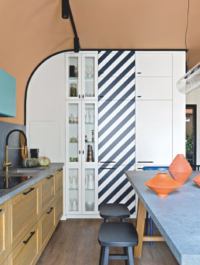 Владелица росла у нас на глазах, вот нам и захотелось сотворить для неё нечто эдакое — комфортное, живое и нескучное. Ведь здесь она проведёт свои лучшие годы. Обратим внимание на кухонные колонны, поскольку у нас они выполняют не только прямую функцию хранения. Во-первых, объём этот скрывает и выравнивает «корявости» строительства: неудачно