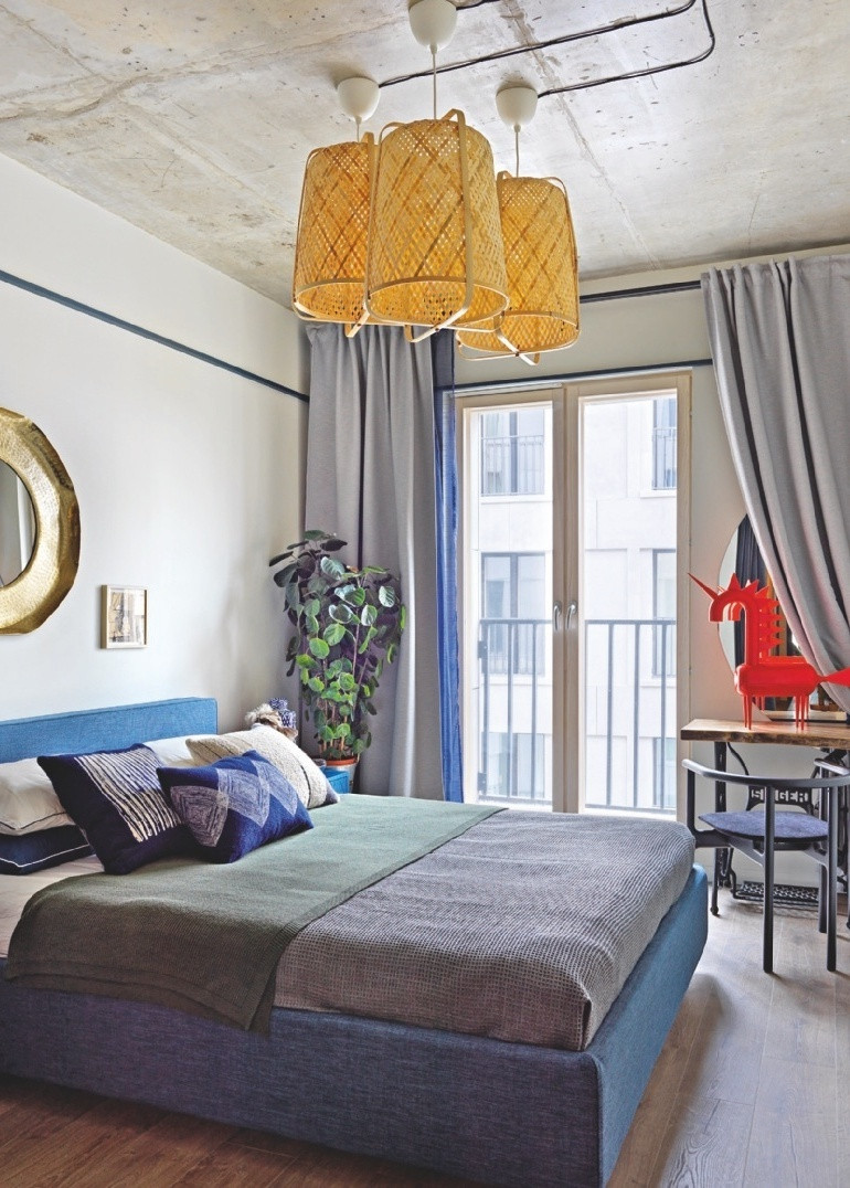 - Аксессуары: подушки PREDMETY shop, серое покрывало H&M Home, зелёный плед DELO design, шторы ИКЕА, металлическое кашпо Zara Home, ваза с синим узором Teak House, красный единорог PALATY store