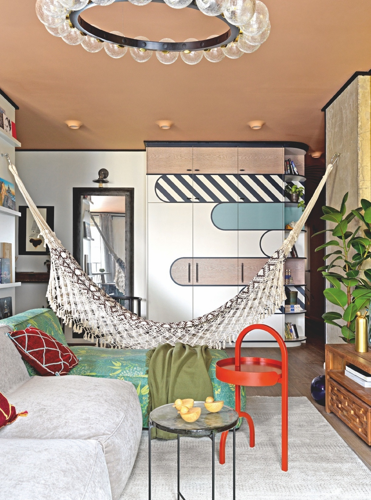 расположенную вентшахту и стояк водоснабжения. Во-вторых, он спроектирован так, чтобы часть секций открывалась в сторону кухни, а часть — в сторону прихожей, то есть туда можно повесить верхнюю одежду. В-третьих, в торце этого объёма спрятана надёжно зафиксированная в полу и на потолке опора для огромного двухместного гамака-кокона, чтобы тот можно было подвесить прямо посередине гостиной. С противоположной стороны гамак крепится к несущему бетонному простенку.