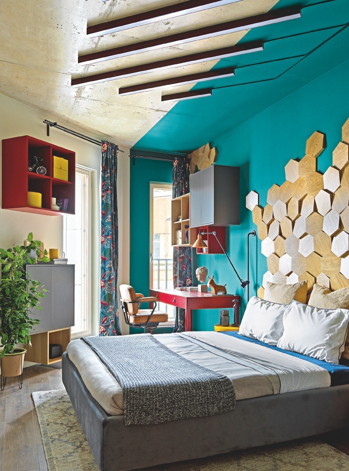- Мебель: разноцветные настенные модули, рабочее кресло ИКЕА, прикроватная тумба La Redoute, рабочий стол THE IDEA