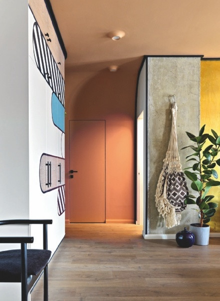 Дизайн. С самого начала работы над проектом авторы рассматривали только эклектику, поскольку в такой интерьер можно добавлять почти всё, что угодно. Но им предстояло подготовить хорошую базу. Интересно, что архитекторы, которые всегда отдавали предпочтение сложным и ярким цветовым решениям, пару лет назад посетили Марракеш, и с тех пор их колористические композиции стали только насыщеннее. Если уж праздник, то на полную катушку! В гостиной, например, две несущие бетонные колонны оставили без отделки, пространство между ними закрыли латунными листами и ко всему этому добавили лососевого цвета потолок. С противоположной стороны переход от потолка к стене сделали радиусным. (По словам авторов, его обустройство стало одним из самых сложных моментов ремонта.) Ну а в обеих спальнях потолки оставили без отделки — чтобы поддержать бетонные колонны в гостиной.