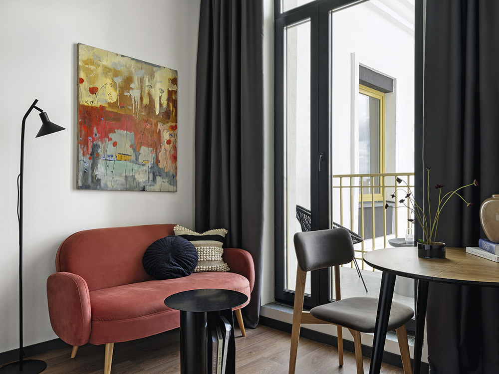 Апартаменты с видом на Яузу — место не для постоянного проживания. Хозяйка, руководитель компании, здесь отдыхает время от времени, перезагружается, вдохновляется и с новыми силами приступает к работе. Интерьер однокомнатной квартиры площадью чуть меньше 30 м2 отлично справляется с этими задачами