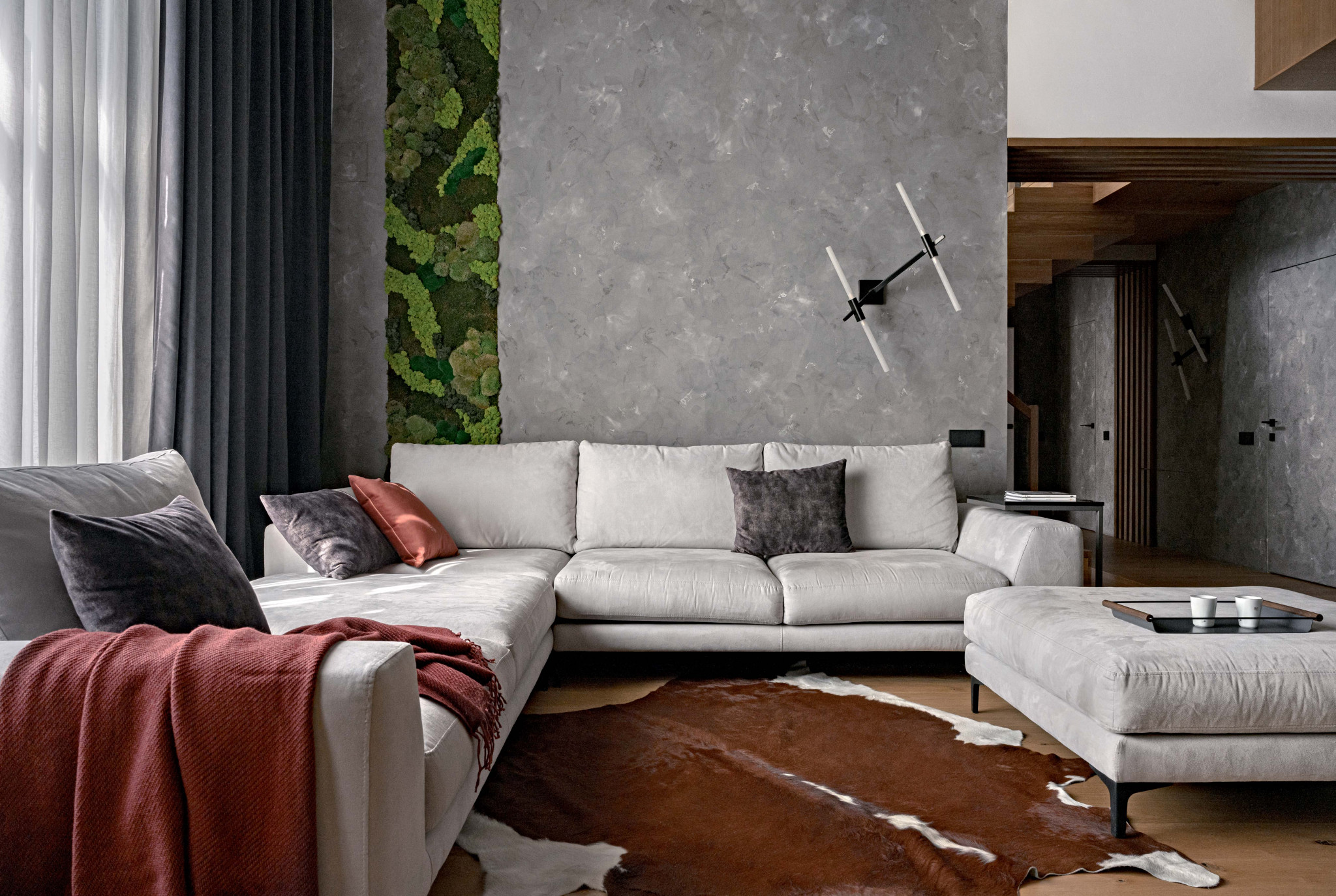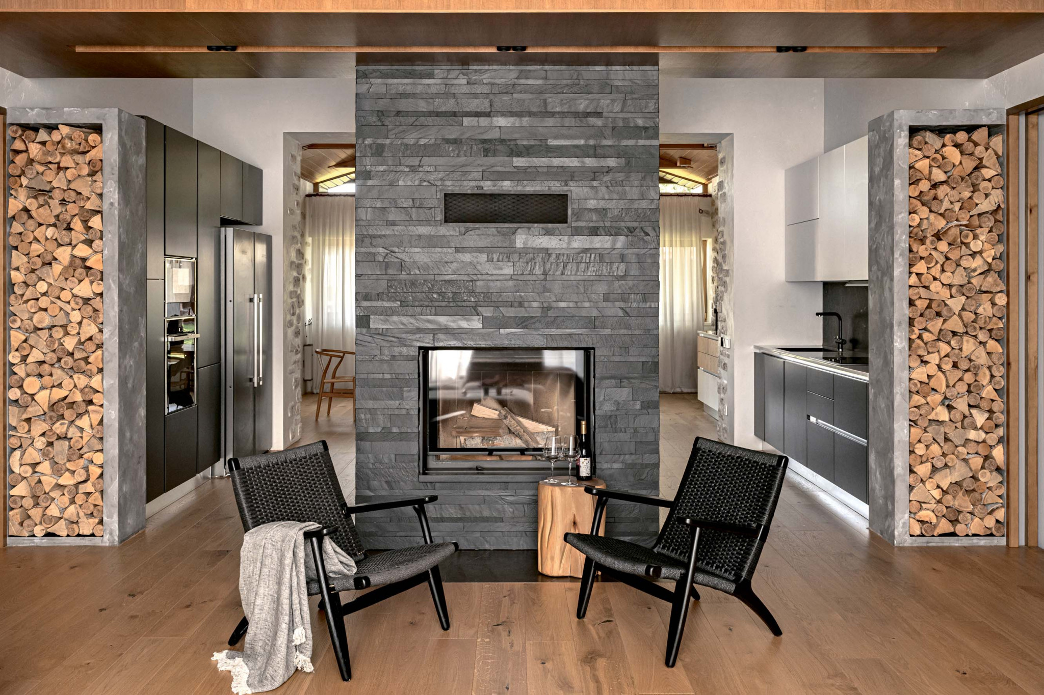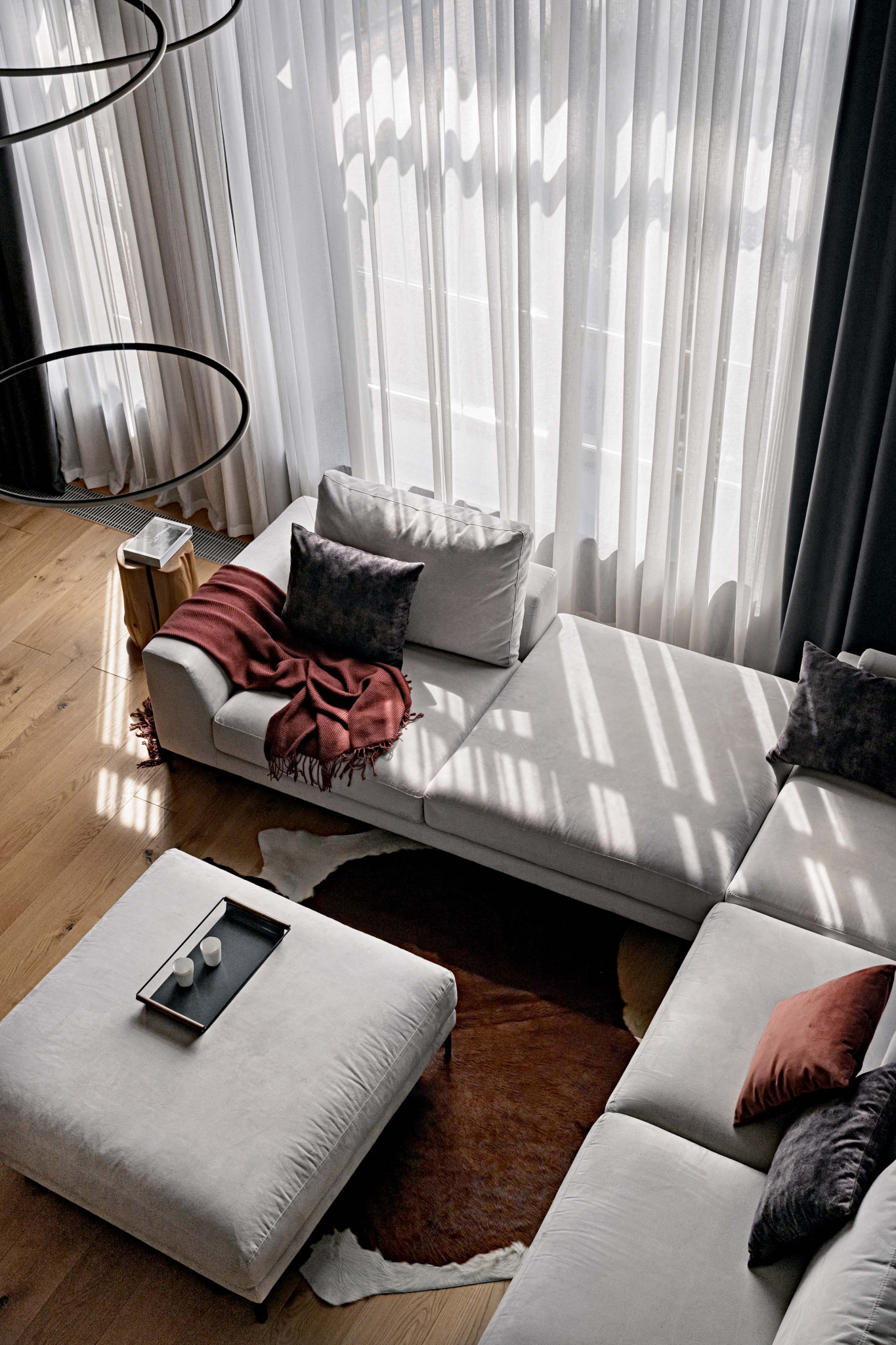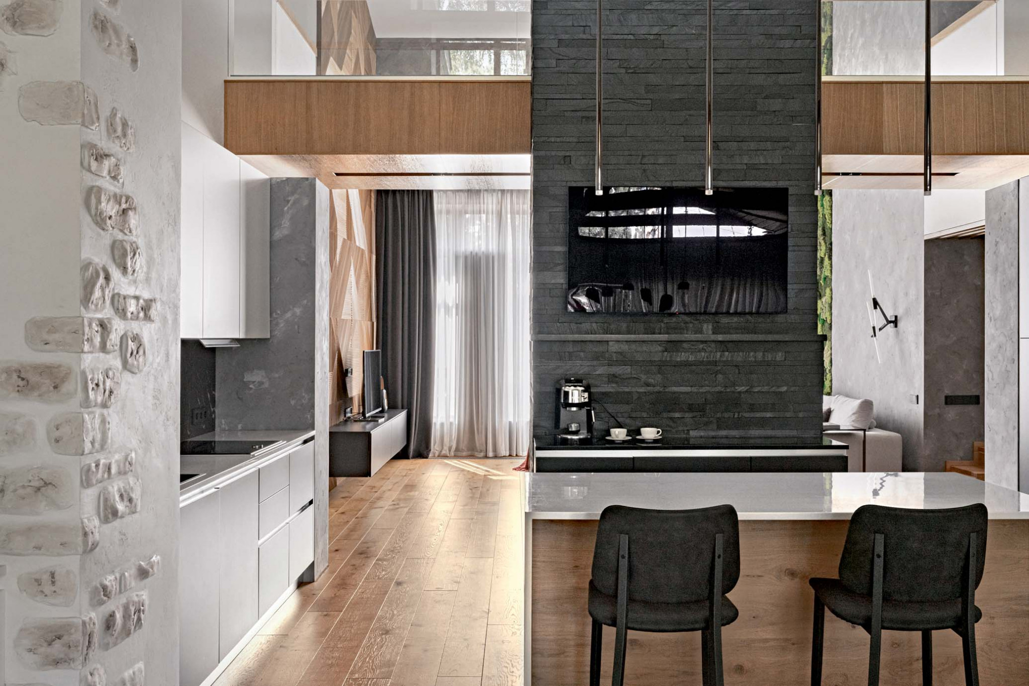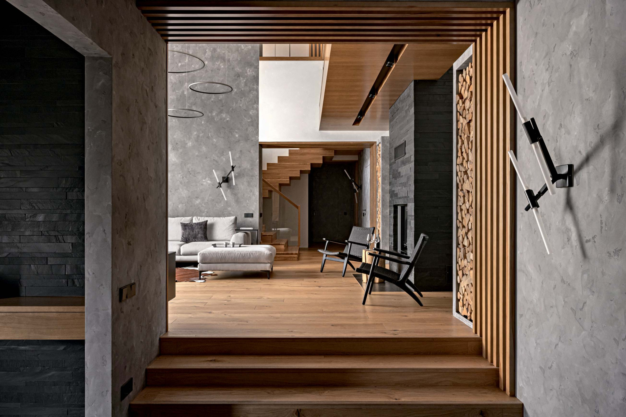 Свои пожелания относительно оформления интерьеров клиенты сформулировали следующим образом: обилие натурального дерева, натуральных текстур и монохромная гамма. Концепция звучала лаконично, однако созданные на её основе интерьеры в современной эстетике с элементами шале привлекают брутальной, но тёплой, сильной и очень чувственной красотой.