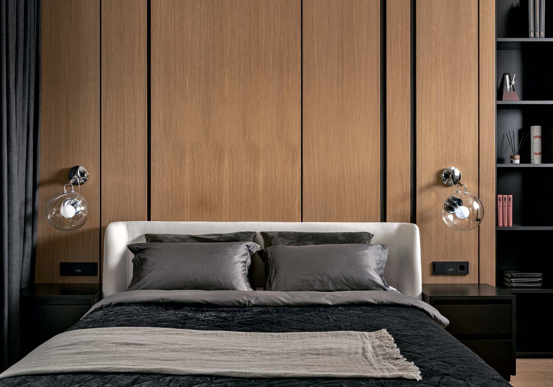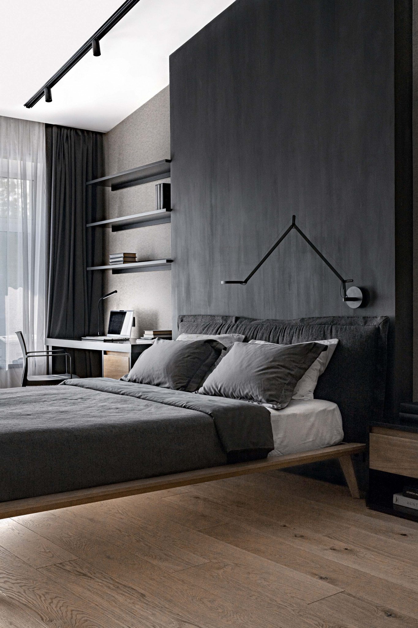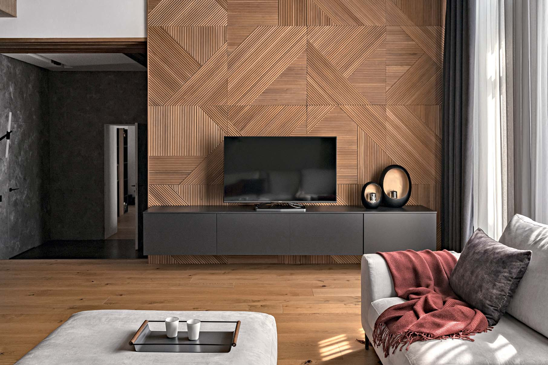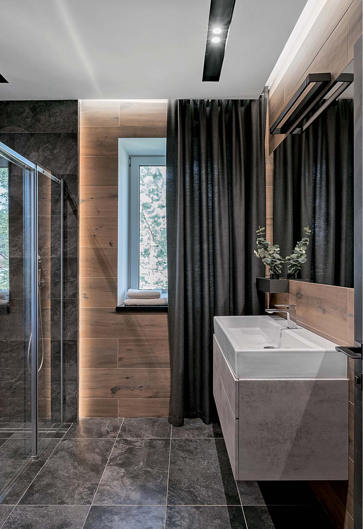 Свои пожелания относительно оформления интерьеров клиенты сформулировали следующим образом: обилие натурального дерева, натуральных текстур и монохромная гамма. Концепция звучала лаконично, однако созданные на её основе интерьеры в современной эстетике с элементами шале привлекают брутальной, но тёплой, сильной и очень чувственной красотой.