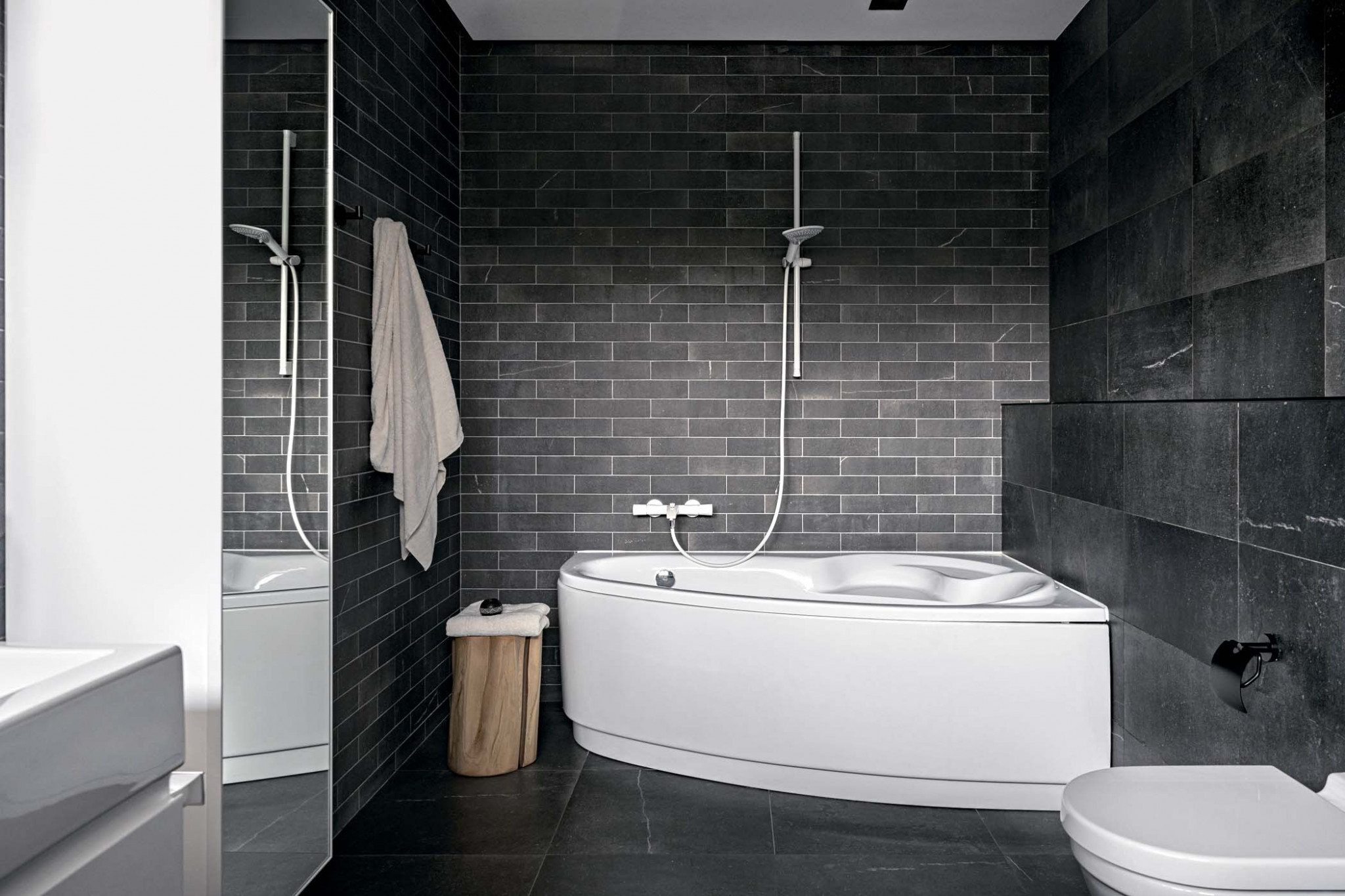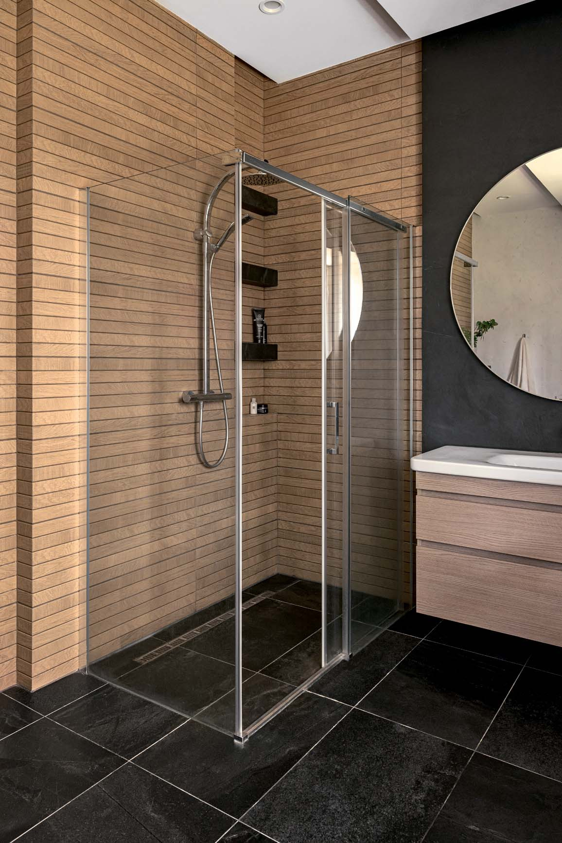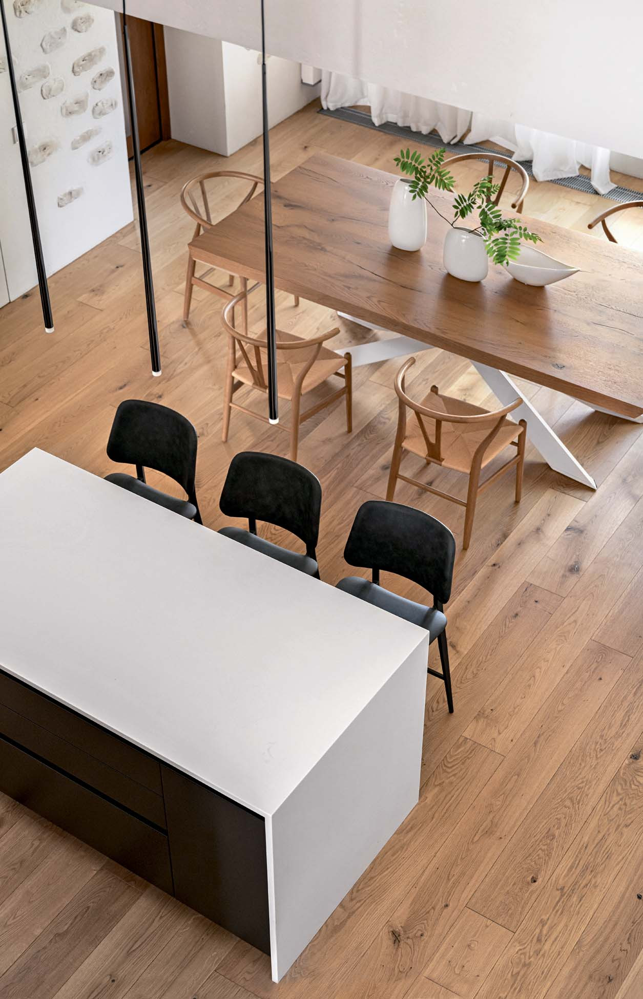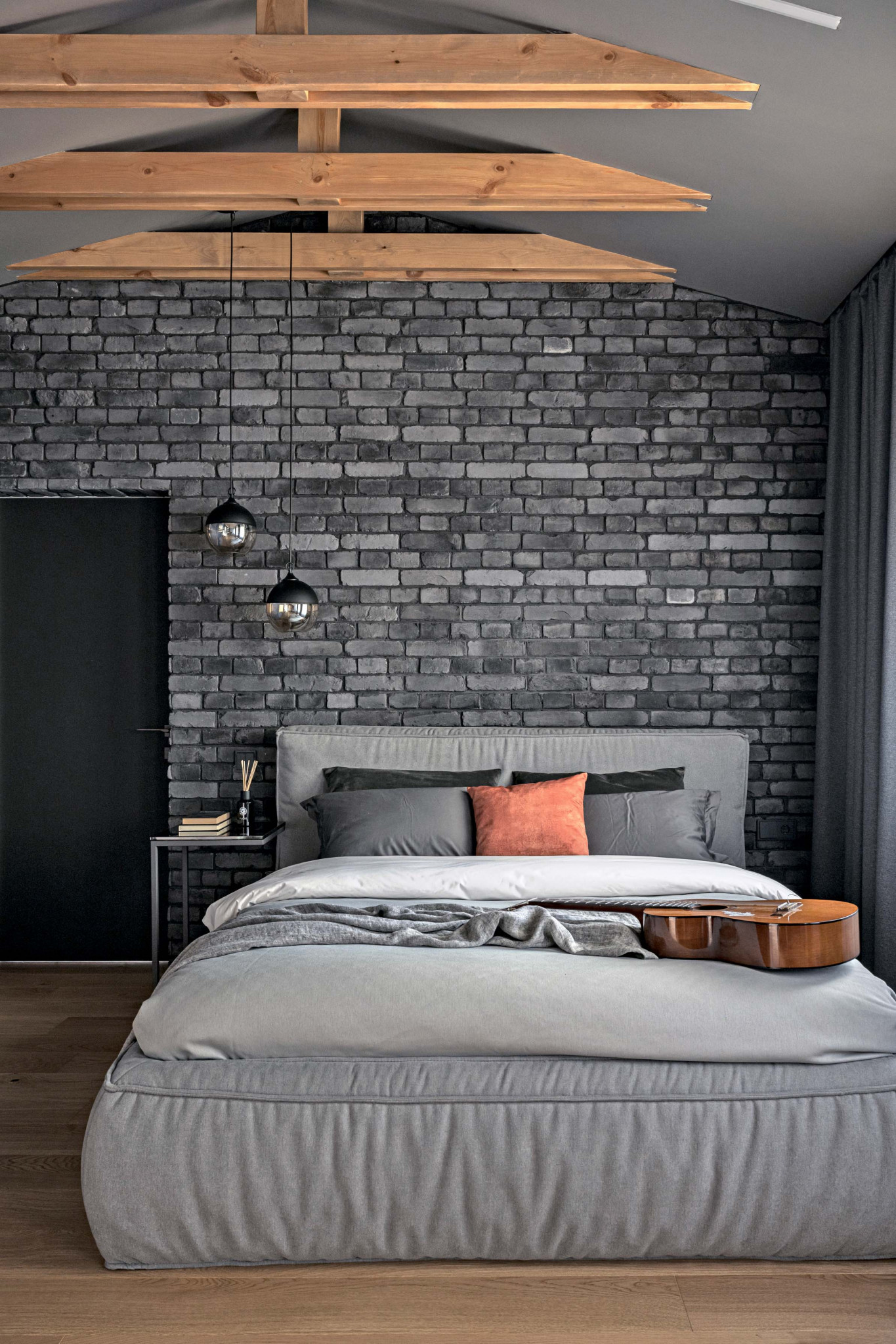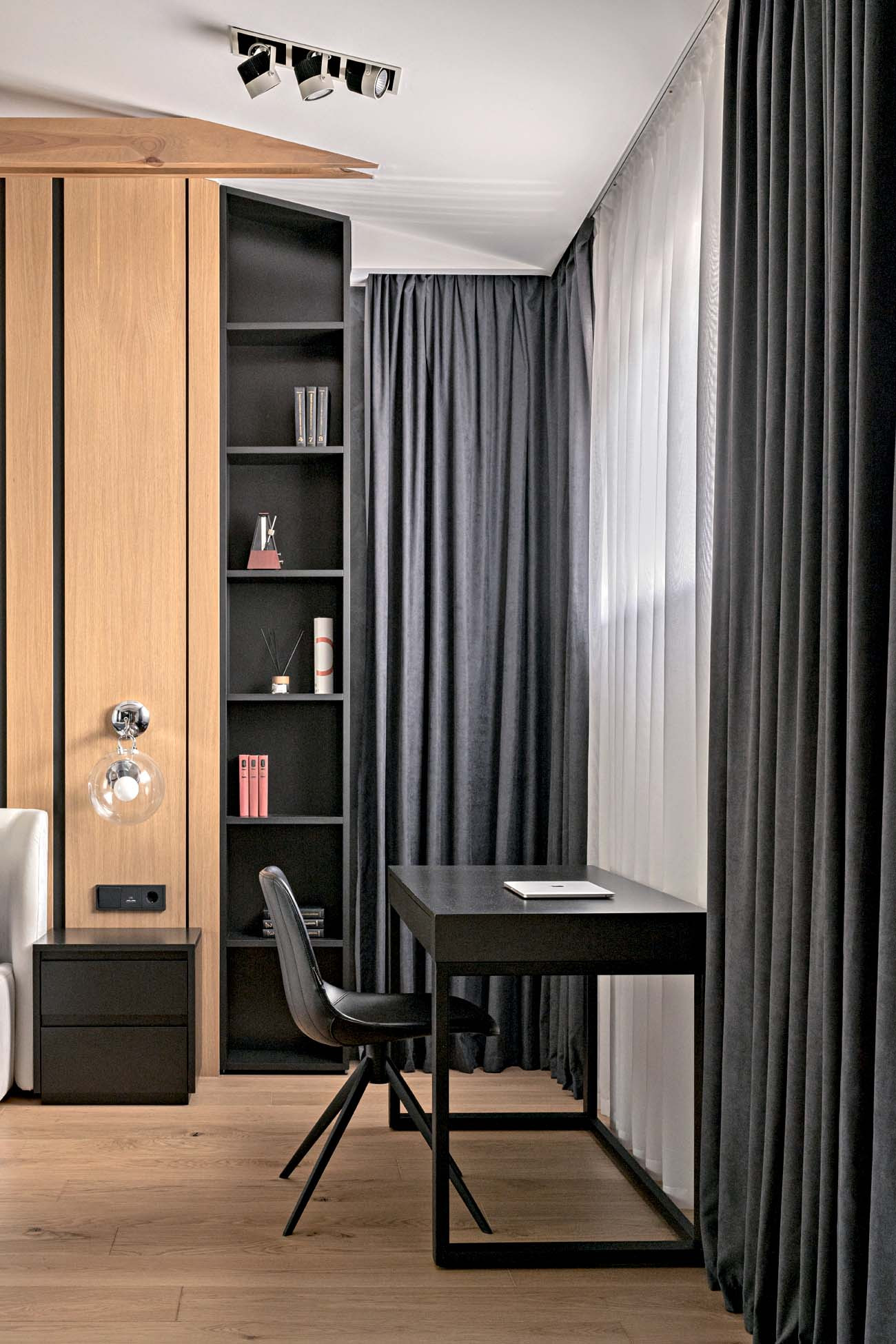 Свои пожелания относительно оформления интерьеров клиенты сформулировали следующим образом: обилие натурального дерева, натуральных текстур и монохромная гамма. Концепция звучала лаконично, однако созданные на её основе интерьеры в современной эстетике с элементами шале привлекают брутальной, но тёплой, сильной и очень чувственной красотой.