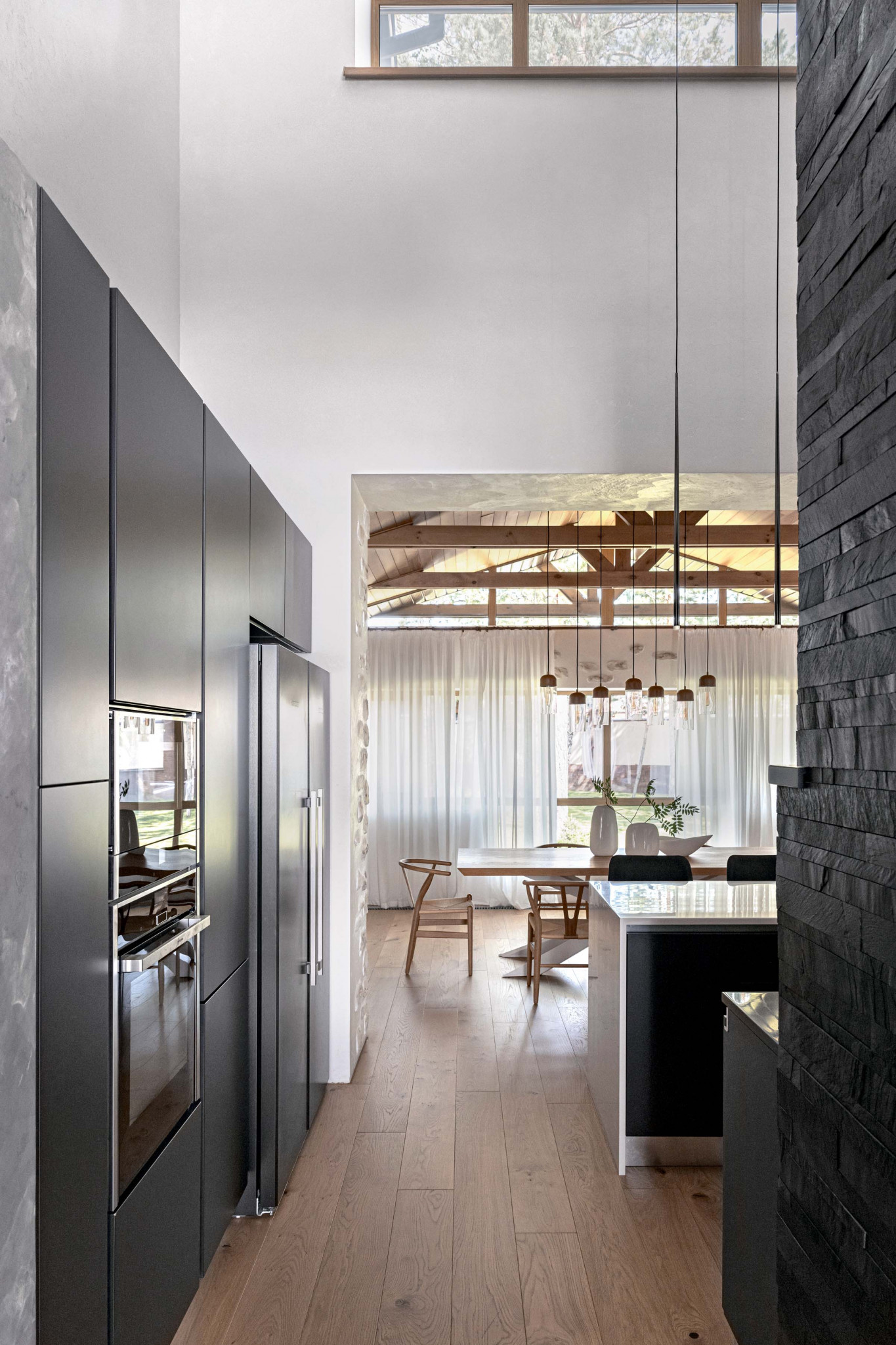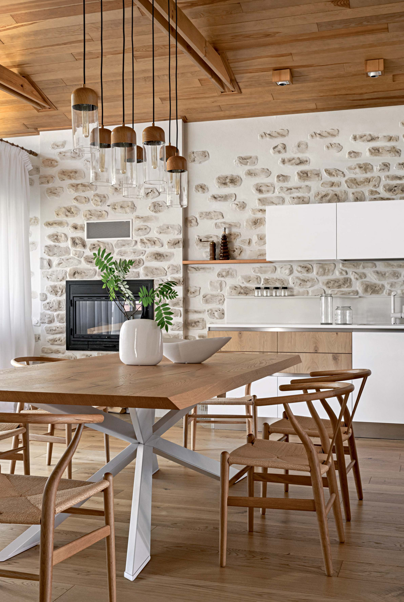 Одно из пожеланий заказчика — соединить в интерьере тёмное и светлое. Причём светлым он хотел видеть только кухонную часть. Так родилась зона кухни-столовой, плавно перетекающая в основное, тёмное жилое пространство. Так как изначально зона столовой проектировалась как веранда с очагом для приготовления пищи, дизайнер сохранила атмосферу патио. На стенах появилась имитация камня, созданная скульптором, на потолке — отделка планкеном из лиственницы, но с декоративными балками, как и в основном пространстве гостиной. Светлое, лёгкое пространство с панорамным видом на задний двор.
