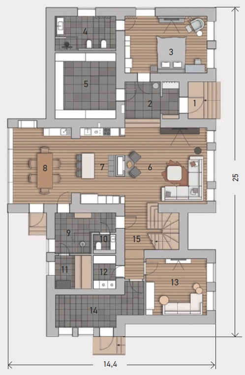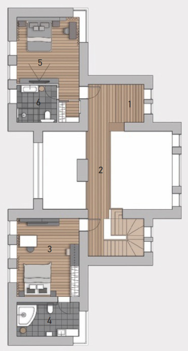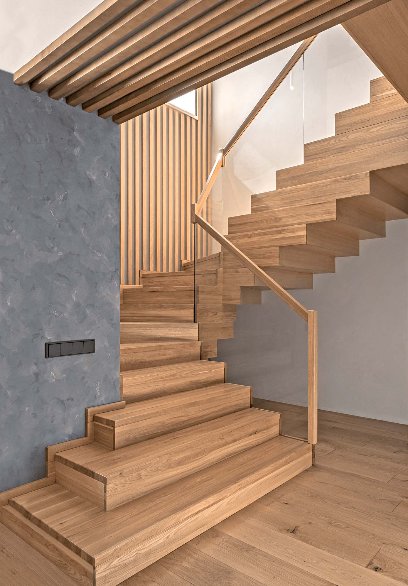 Скандинавский стиль построения фасадов, декоративные элементы кровли удачно сочетаются с перетекающими пространствами интерьера: гостиная плавно переходит в блок кухни-столовой, а галерея, словно мост, протянутая рука между двумя поколениями, объединяет разнесённые жилые блоки, которые дают возможность независимого процесса жизнедеятельности. Деревянные фермы, балки и контрфорсы, расположенный по центру камин, как символ объединения семьи, логично дополняют замысел. Основой для интерьера послужили геометрия дома и архитектурные элементы. Экстерьер и интерьер должны были стать единым целым. Проектирование началось с лестницы, переходящей в «балкончик». Было желание создать современный, минималистичный, но при этом обволакивающий, расслабляющий, тёплый интерьер. С простыми формами, чистыми линиями, мягкими тканями, обилием натурального дерева в сочетании с фактурой камня и декоративной штукатурки. Так мы получили современный интерьер с элементами стиля шале. Уютную загородную берлогу — стильную и функциональную.