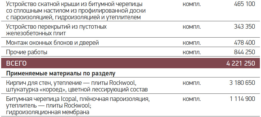 - Наружные стены: кирпич 510 × 250 мм, утепление — плиты Rockwool, декоративная отделка — штукатурка «короед», цветной лессирующий состав