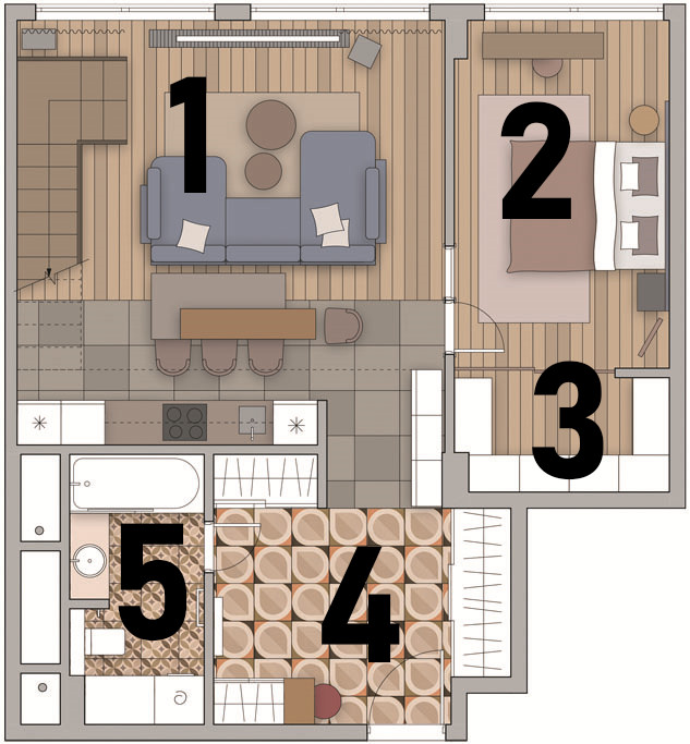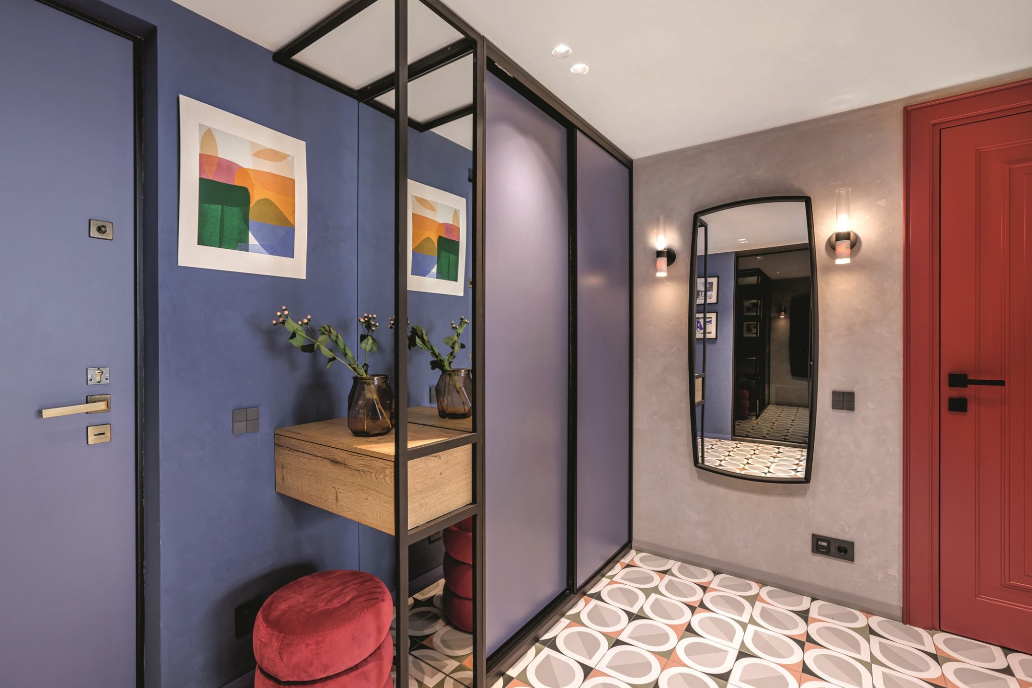 Непростой задачей стало распределение высоты между антресолью и нижним уровнем, где расположены входная зона и санузел. Высота потолка здесь всего 2,15 м. Его окрасили в белый цвет, чтобы не возникало дискомфорта, а пол прихожей оформили акцентными плитками керамогранита, которые сразу притягивают взгляд. Высота потолка на антресоли — 2,1 м. Здесь вместо инженерной доски использовали более тонкий материал: износостойкий кварцвинил толщиной всего 5 мм с декором, достоверно имитирующим текстуру дерева.
