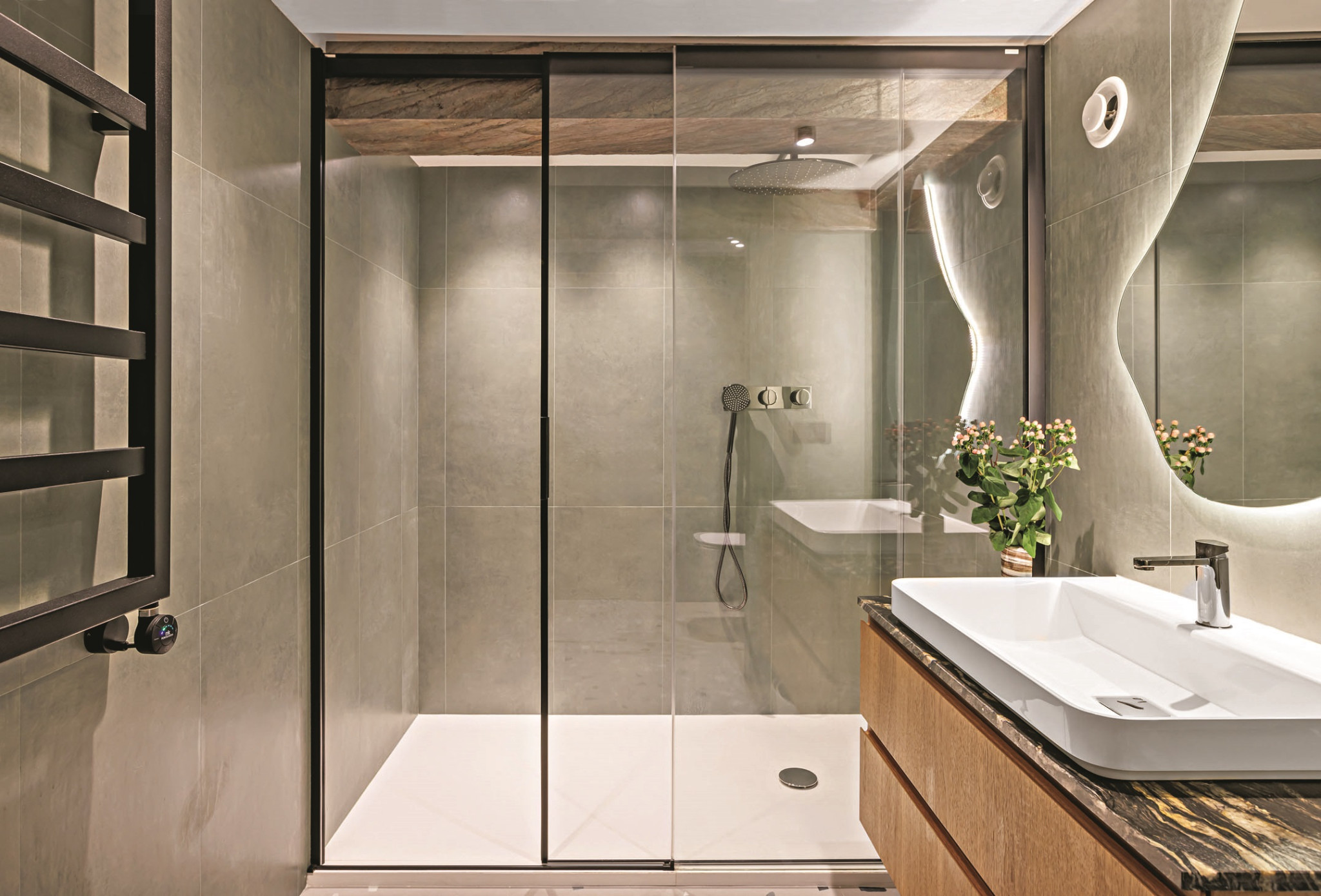 - Мебель: тумба и раковина — Gamma Décor, стеклянная перегородка Duka