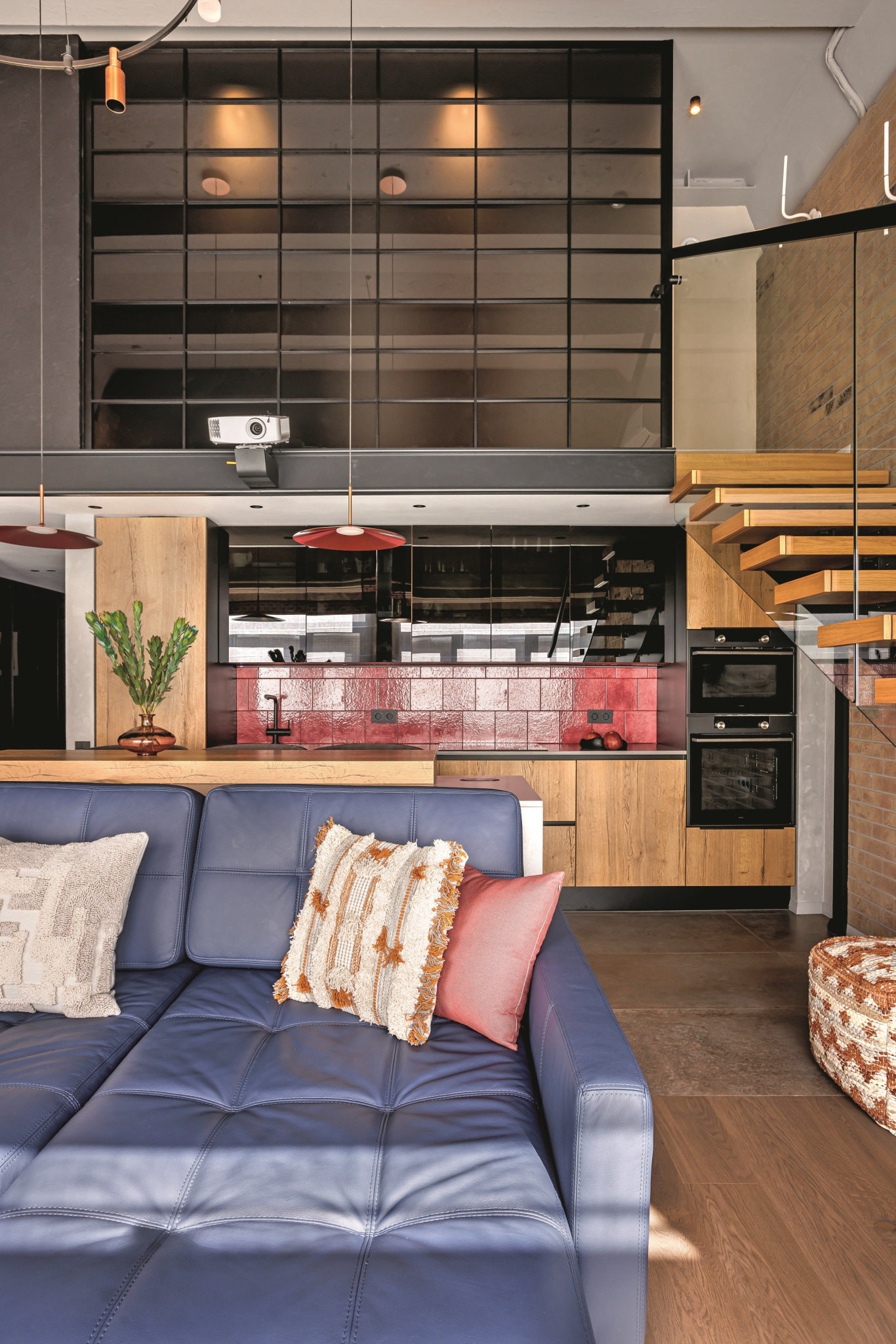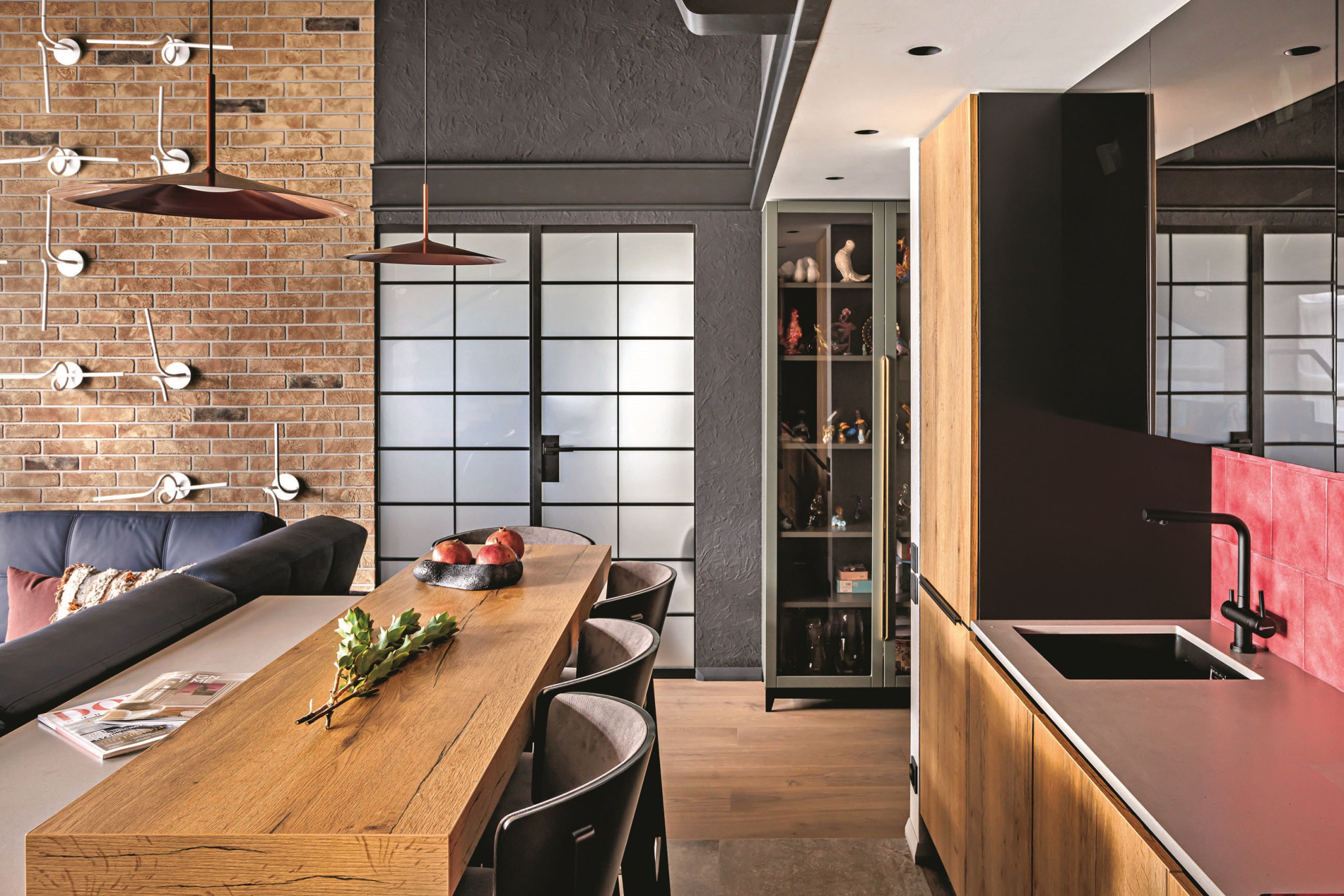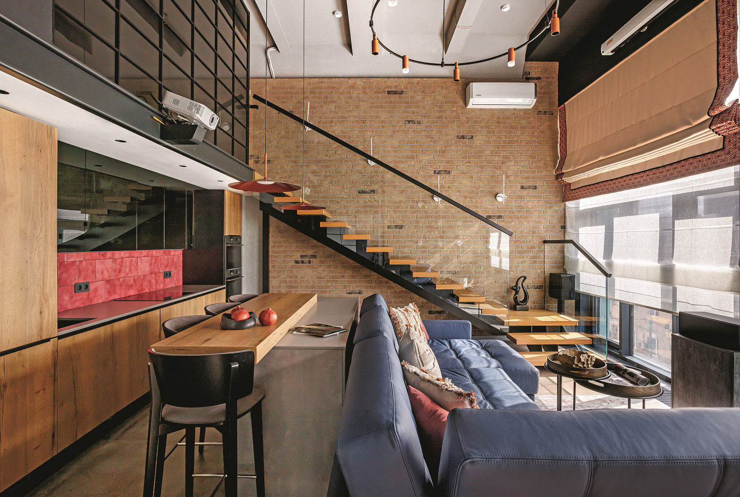Главное украшение квартиры — кухня-гостиная с высотой потолка 4,75 м. Отсутствие в ней лишних стен, простор и обилие света наглядно демонстрируют достоинства лофта. Кирпичные стены, характерный элемент индустриальной эстетики, представляют собой слой декоративной штукатурки, нанесённый по трафарету, а затем раскрашенный художниками. Плитка кухонного фартука обожжена вручную мастерами небольшой фабрики, благодаря чему каждая имеет неповторимые оттенок и фактуру. Красный цвет керамики в сочетании с яркой обивкой дивана смотрится очень колоритно.
