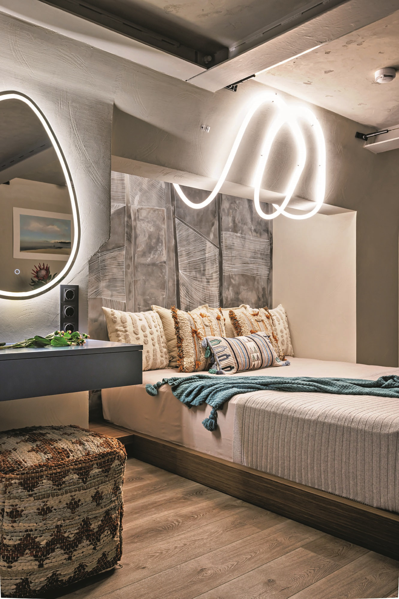 Квартиру непростой архитектуры, с огромной антресолью и множеством несущих балок, дизайнер предложила оформить в стиле лофт. Это помогло сохранить атмосферу здания бывшей типографии, превращённого в жилой корпус. Визуально лёгкая лестница и оригинальные элементы декора привнесли в интерьер яркие акценты и некоторую эклектичность.