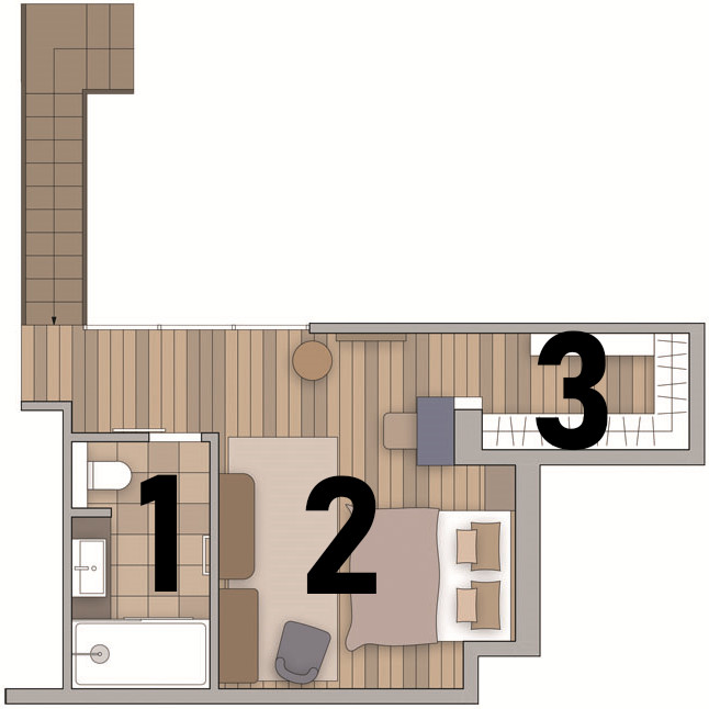 Ремонт. В квартире не было ничего, кроме несущих балок и выполненной стяжки. Новые стены возвели из пеноблоков. Установили Г-образную лестницу с промежуточной площадкой, на которой без проблем могут разойтись два человека. Такая конструкция обеспечивает безопасное и удобное перемещение. Чтобы прилегающая к стене лестница выглядела более воздушной, ступени прикрепили на косоур без подступенков, а в качестве ограждения использовали прозрачное закалённое стекло.