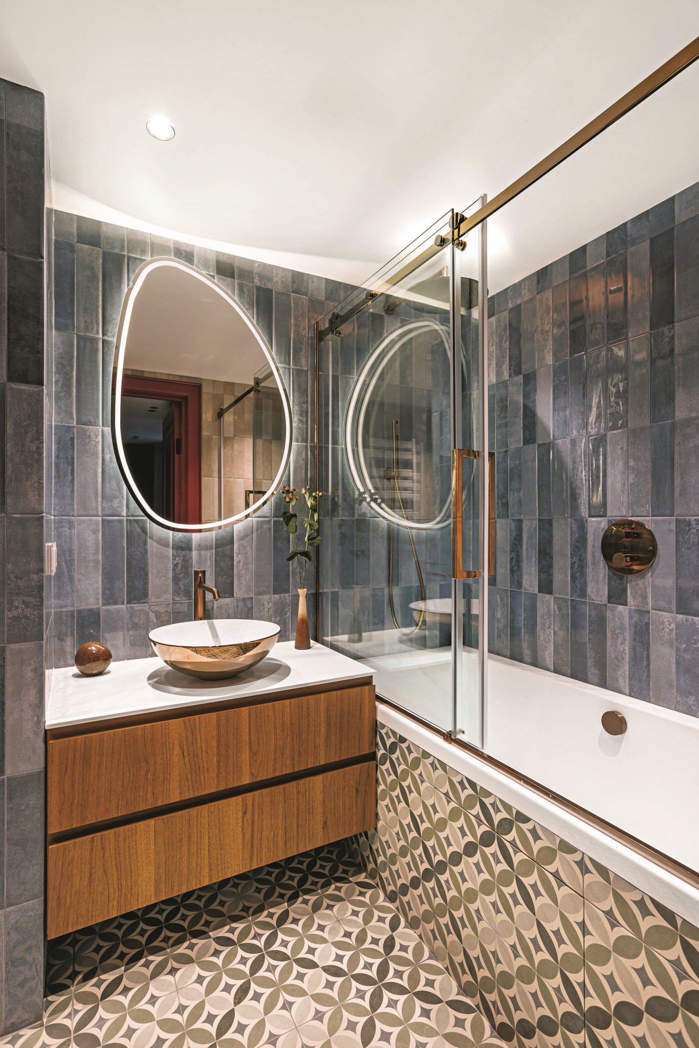 Включать и выключать подсветку можно разными способами: сенсорной кнопкой на зеркальной поверхности/корпусе или взмахом руки над специальным датчиком. В последнем случае исключается контакт влажных рук с источником электричества, что максимально безопасно. Весьма полезна в ванных комнатах функция антизапотевания. Она позволит без помех увидеть отражение при высокой влажности после водных процедур. Стоимость зеркала с подсветкой зависит от его размера, сложности изготовления, типа полотна. В обоих санузлах квартиры и в спальне дочери зеркала неправильной формы. Эта идея понравилась заказчицам, так как мягкие линии помогают сбалансировать помещения с множеством прямых углов.
