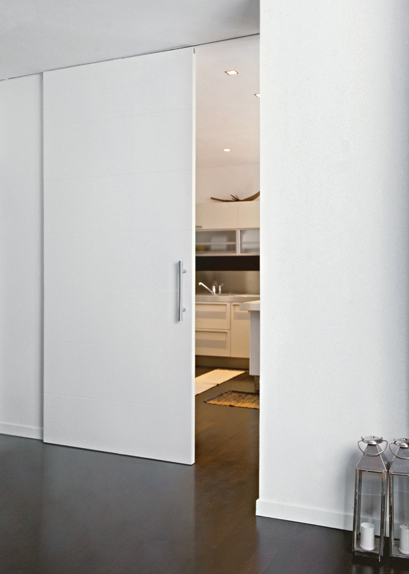 Простейший механизм сдвижной однопольной двери с верхним подвесом состоит из верхнего направляющего рельса (трека), оснащённого боковыми стопорами (ограничителями хода), двух роликовых кареток и напольного направляющего флажка, который предотвращает раскачивание полотна. У двупольной (раздвижной) двери соответственно флажков два, а кареток четыре. Обе конструкции всё чаще оборудуют доводчиком — устройством, автоматически плавно закрывающим дверь.
