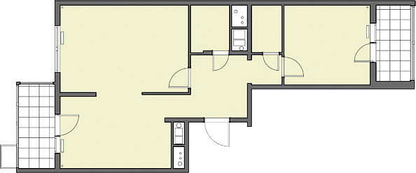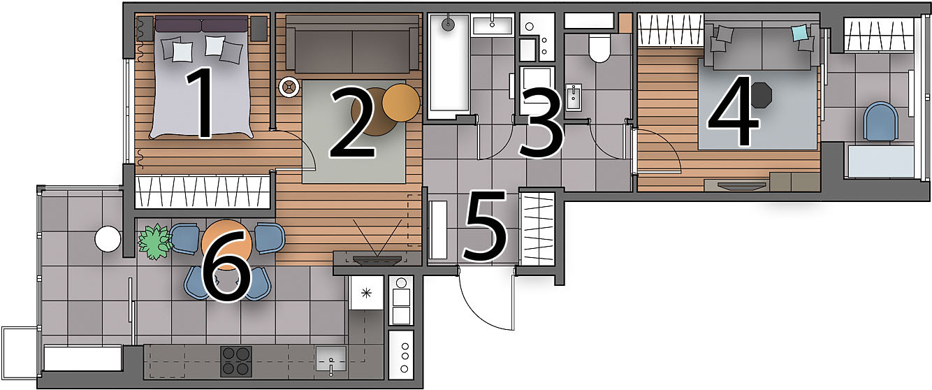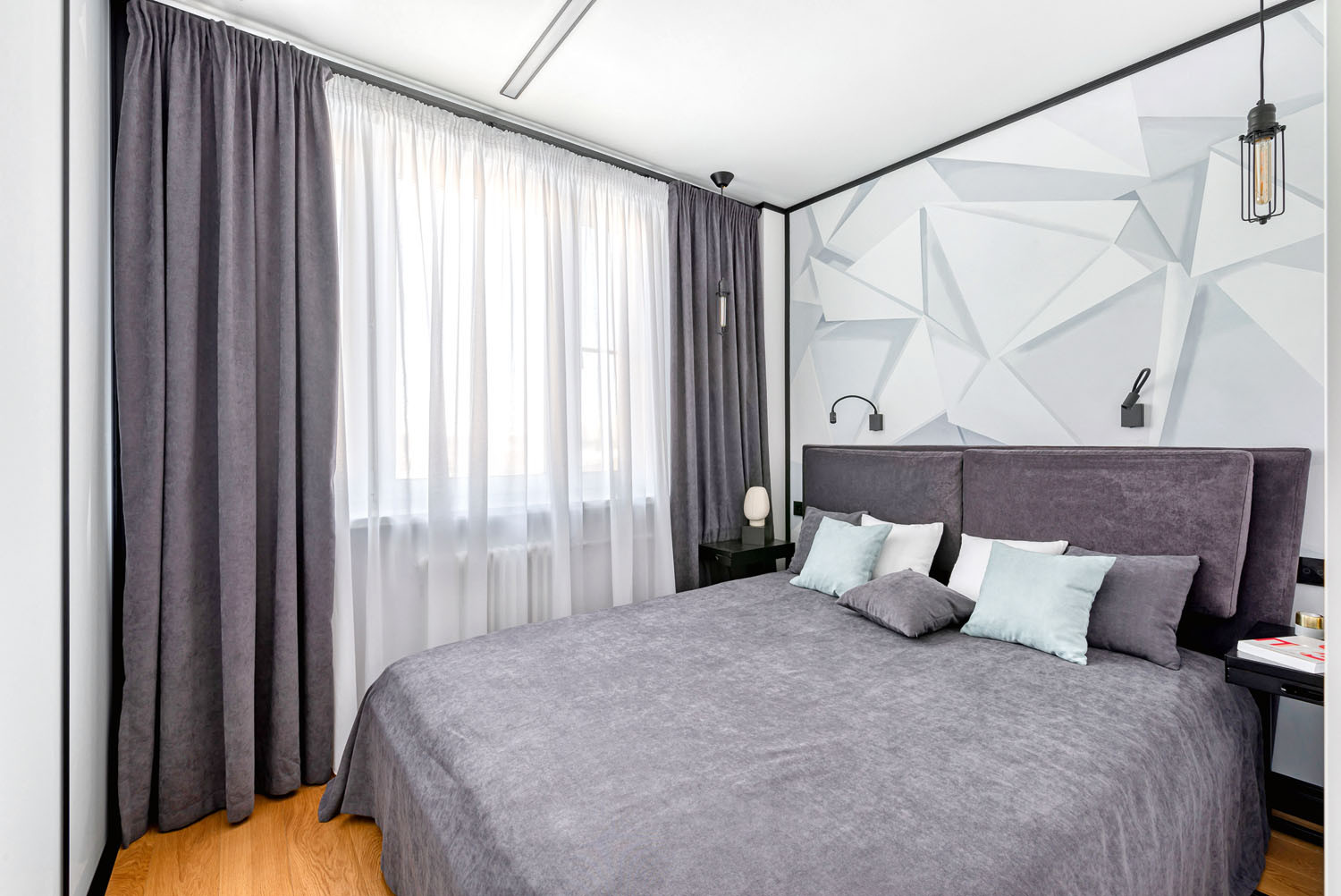 Перепланировка. Возможности перепланировки двухкомнатной квартиры в панельном доме, так называемой распашонки, то есть с окнами, выходящими на противоположные фасады, изначально были ограничены. Поиграть пространством позволяла лишь левая часть квартиры, в которой между кухней и жилой комнатой имелся фрагмент ненесущей перегородки. Его ликвидировали, тем самым выделив отдельную хозяйскую спальню и объединённую кухню-гостиную необычной конфигурации. Очевидными плюсами такого решения стали: увеличение количества жилых помещений (три вместо двух), приватность спальни хозяйки, ощущение свободного, а не замкнутого пространства репрезентативной зоны и естественная освещённость гостиной без окон. Свет из окна кухни теперь проникает не только в гостиную, но даже в холл при входе в квартиру.