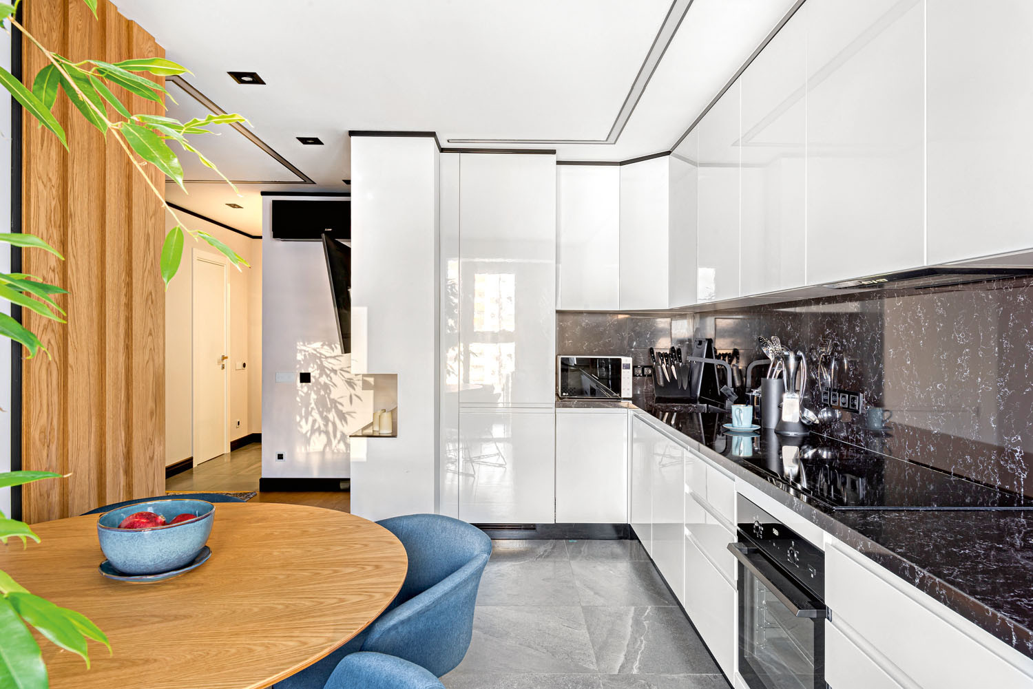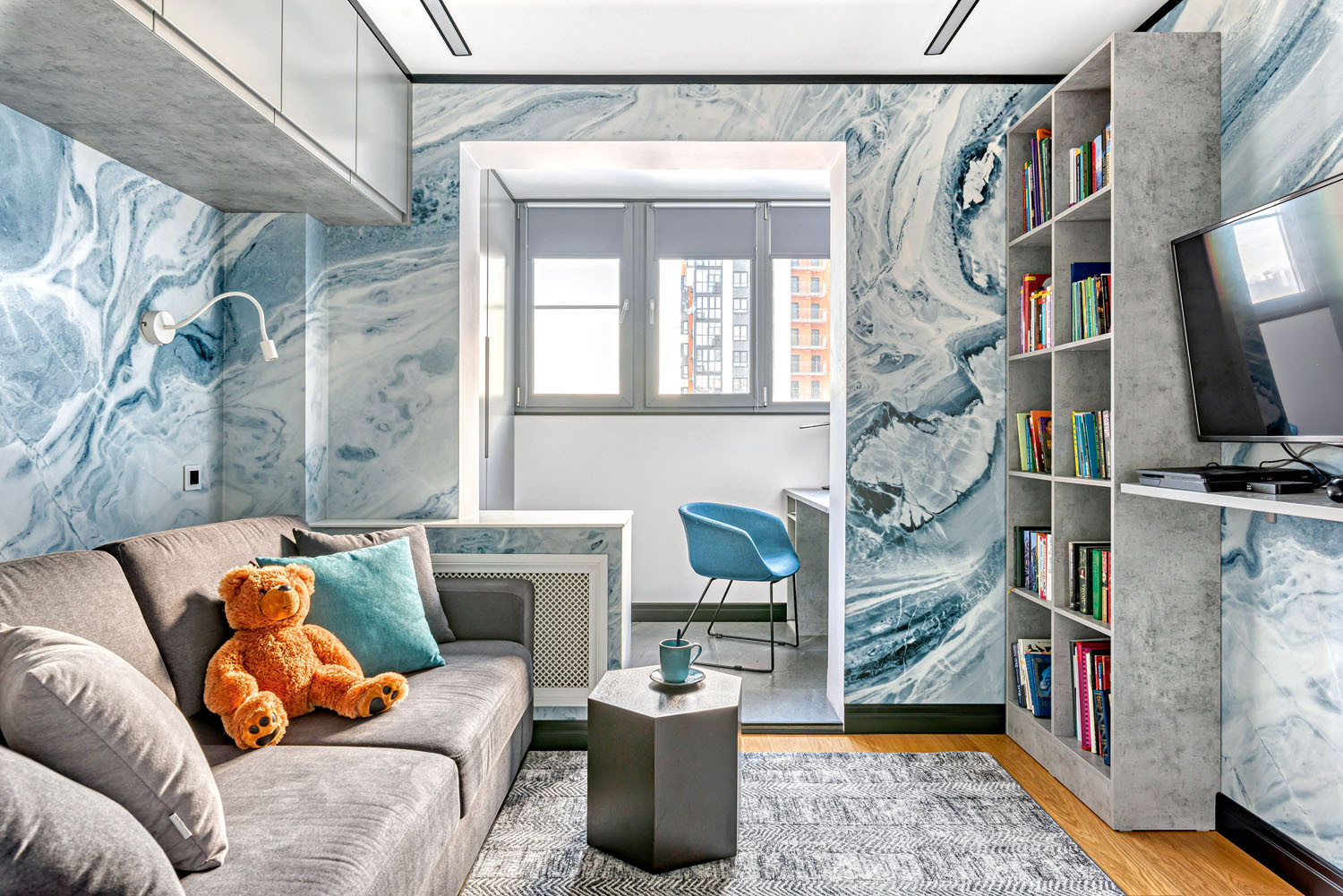 Главными пожеланиями владельцев новой квартиры, расположенной на северо-западе столицы, в доме серии «ДОММОС», являлись современное интерьерное решение и индивидуальная планировка. Хозяйка — молодая женщина, бизнес-леди — считает важным совместный досуг с сыном-подростком, для чего им оптимально подходит объединённая кухня-гостиная. В то же время каждому из членов семьи требовалось личное пространство.