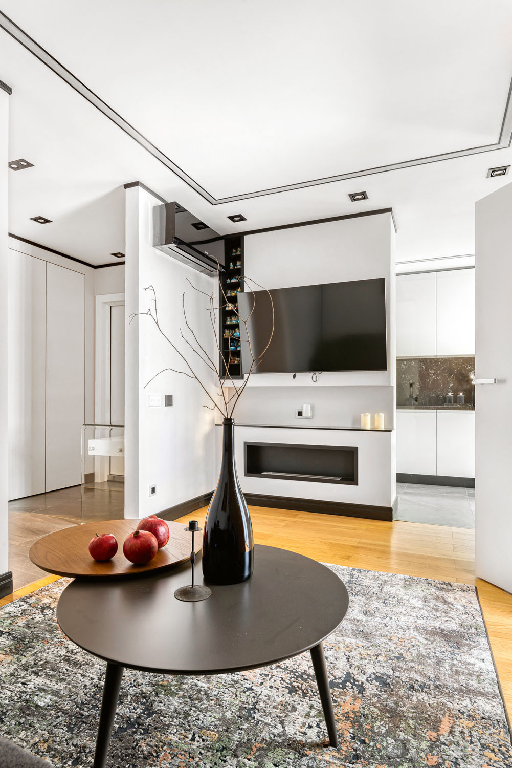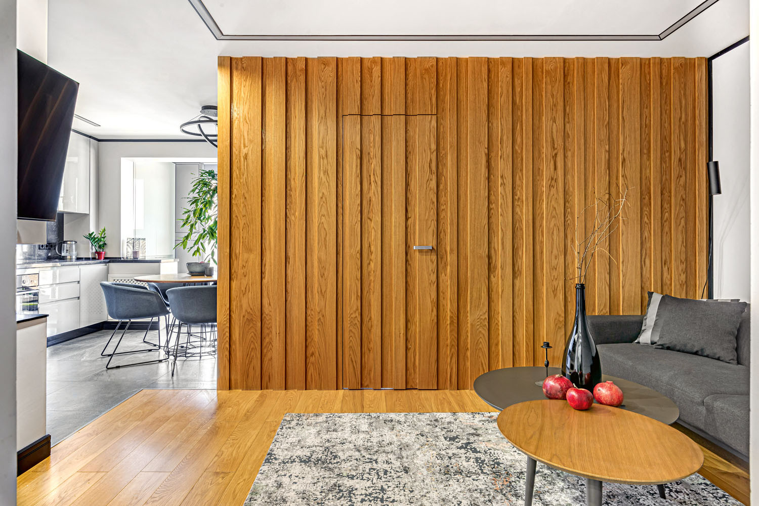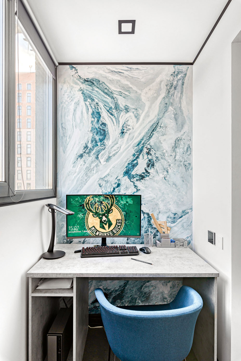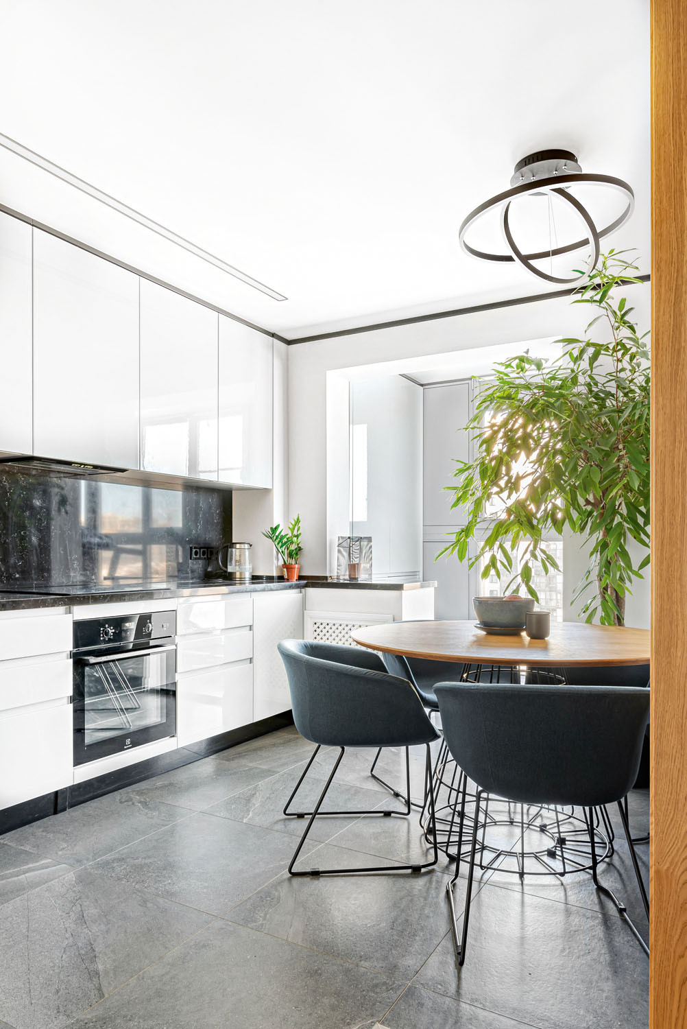 Заказчица хотела монохромную цветовую гамму. Перед началом проектирования она обсуждала с дизайнером сдержанность, строгость и чёткость будущего интерьера квартиры, исполненного в белых, серых и чёрных тонах. Однако дизайнер предложила взять монохром лишь за основу в выборе цветовой палитры. Чтобы бело-серо-чёрные цвета не казались мрачными и слишком холодными в интерьере, их смягчили тёплыми оттенками дерева и сине-зелёным цветом в кухне, нежными голубыми оттенками в спальнях.