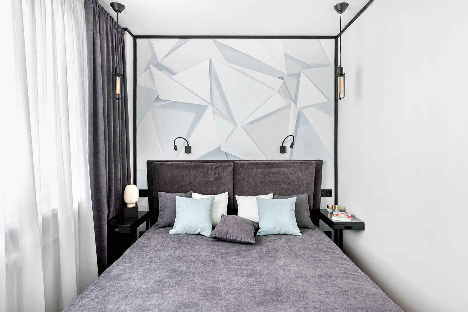 Чёткость и упорядоченность среде обитания придают ахроматическая гамма, стеновое покрытие с геометрическим орнаментом, конструктивно простая, но утилитарная обстановка.