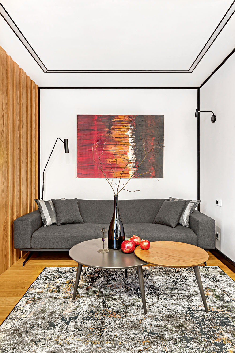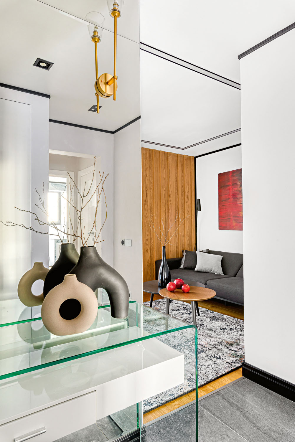 Интерьер отражает сильную личность хозяйки: чёткость, целеустремлённость. Тонкие рамки, присутствующие в отделке стен и потолка, — аллюзия к упорядоченной, идущей по определённым правилам жизни. Поскольку бюджет имел большое значение, хозяйка сама руководила ремонтом, а все товары, в том числе и мебель, были тщательно подобраны