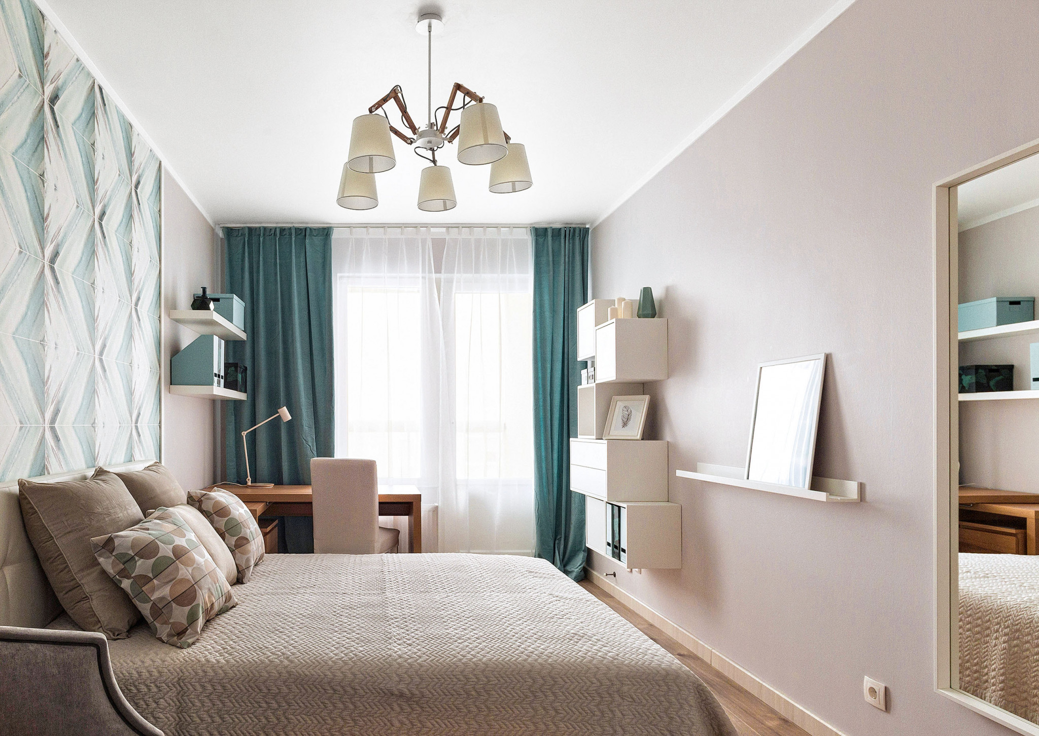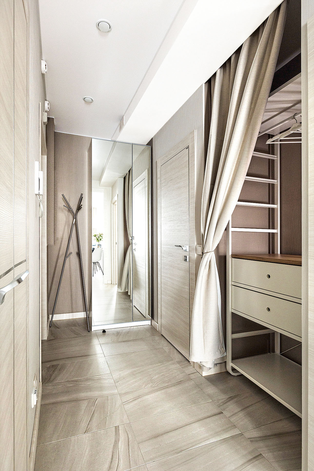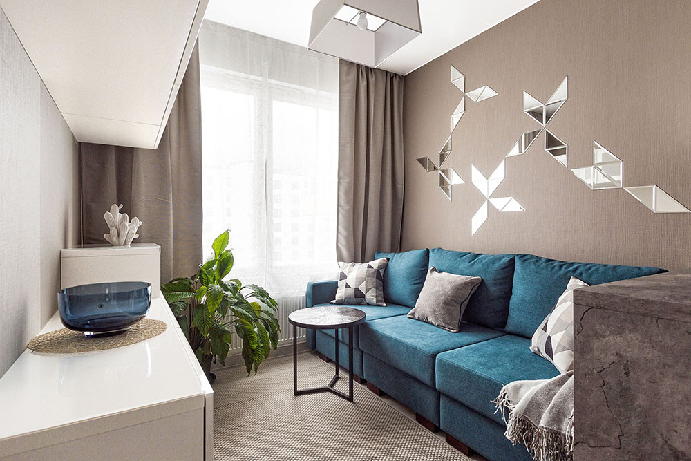 Планировка. Вытянутый прямоугольник квартиры с небольшой ступенчатой выемкой в зоне входной двери разделён на два помещения, им соответствуют два окна, из одной комнаты предусмотрен выход в лоджию. Структура, предложенная компанией-застройщиком, устраивала заказчика. В одной комнате обустроили спальню-кабинет с проходом в гардеробную, в другой — студию. В двух карманах при прихожей спроектировали один отсек для хранения одежды и вещей, другой — для мини-постирочной. Сохранение первоначальной структуры позволило сосредоточить внимание на декоре и предметах обстановки.