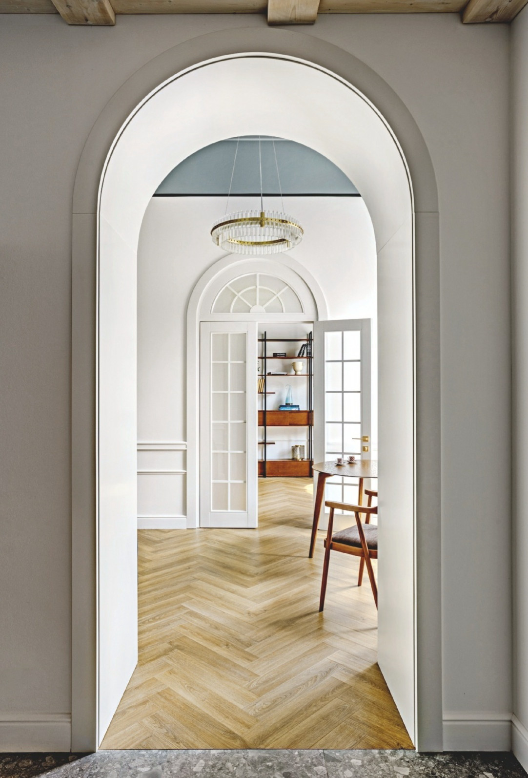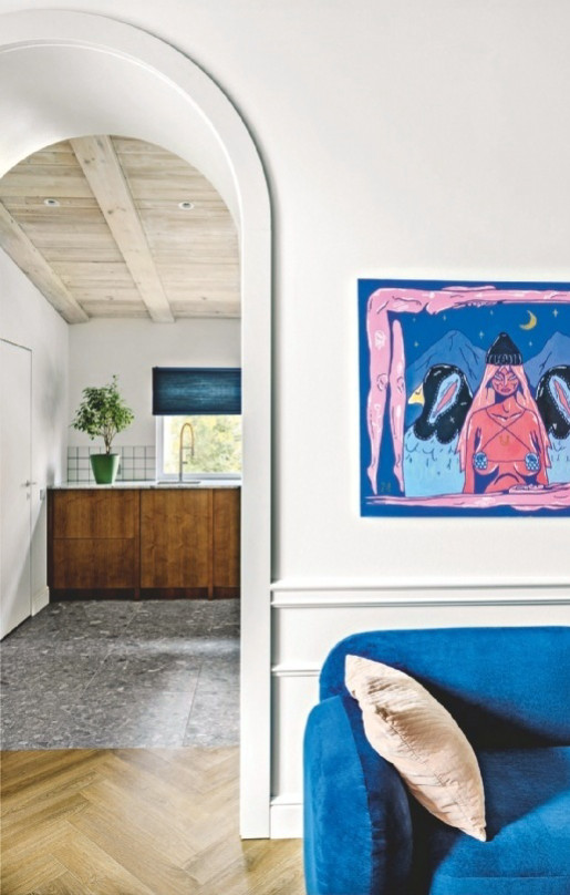 Дизайнер увидел в ситуации ключевой положительный момент — возможность поддержать интерьером аутентичность, сделать перепланировку и проложить коммуникации в соответствии с современными представлениями о комфорте. В пристройке, согласно новому проекту, разместили мини-котельную, кухню и санузел. В кладовой — гардеробную и мини-прачечную. Кухню, гостиную и спальню соединили высокими арочными проёмами, подчеркнув архитектуру окон и объёмы помещений.