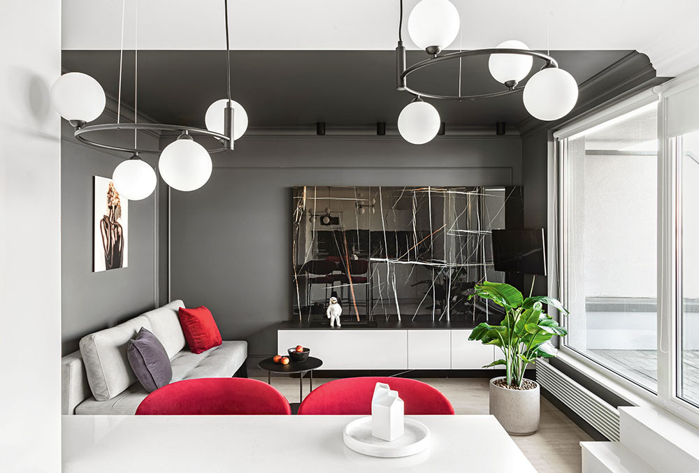 В квартире для посуточной аренды, расположенной на последнем, десятом этаже монолитно-кирпичного дома, требовалось обустроить комфортную зону отдыха. Функционалу временного пребывания оптимально соответствовала объединённая кухня-гостиная, позволяющая расслабиться и перекусить, пообщаться, посмотреть телевизор. Для приготовления и приёма пищи — только самое необходимое. Зато спальных мест запланировано по максимуму — для одного — пяти гостей. (В спальне и гостиной предусмотрены дополнительные пространства для сна, а раскладная или надувная мебель доставляется по надобности.) Системы хранения компактны, но полностью соответствуют задаче размещения на короткий срок.