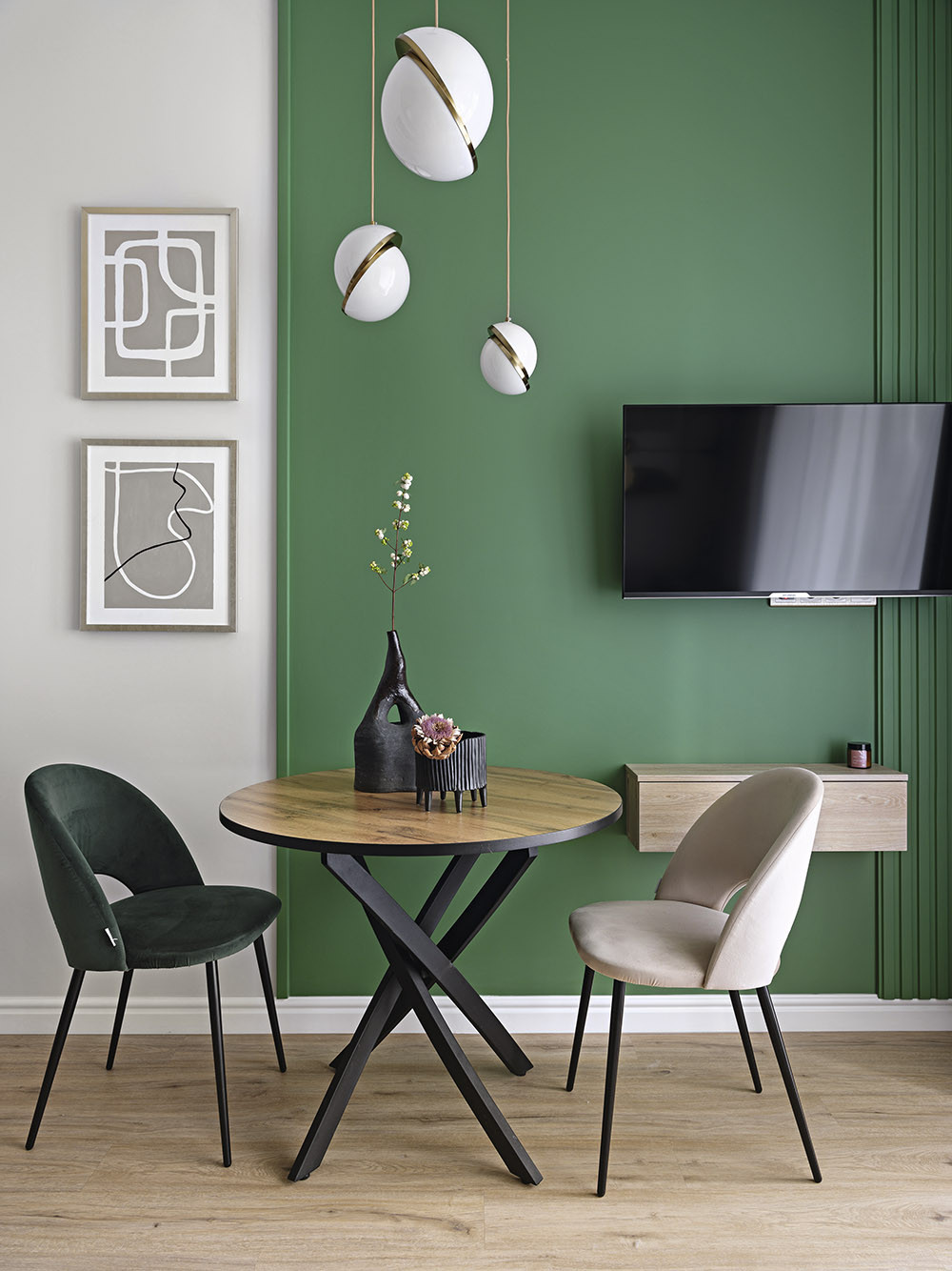 Небольшая квартира находится в одном из домов жилого района Ália на живописном берегу Москвы-реки на северо-западе столицы. Спроектирована застройка по принципу «15-минутный город», где всё необходимое для комфортной жизни находится в шаговой доступности. Жильё принадлежит молодой девушке. С ней проживают кошка Феня и кот Миша. Хозяйка работает в сфере IT, а свободное время отдаёт хобби — изготовлению мисок для животных из каменной керамики.