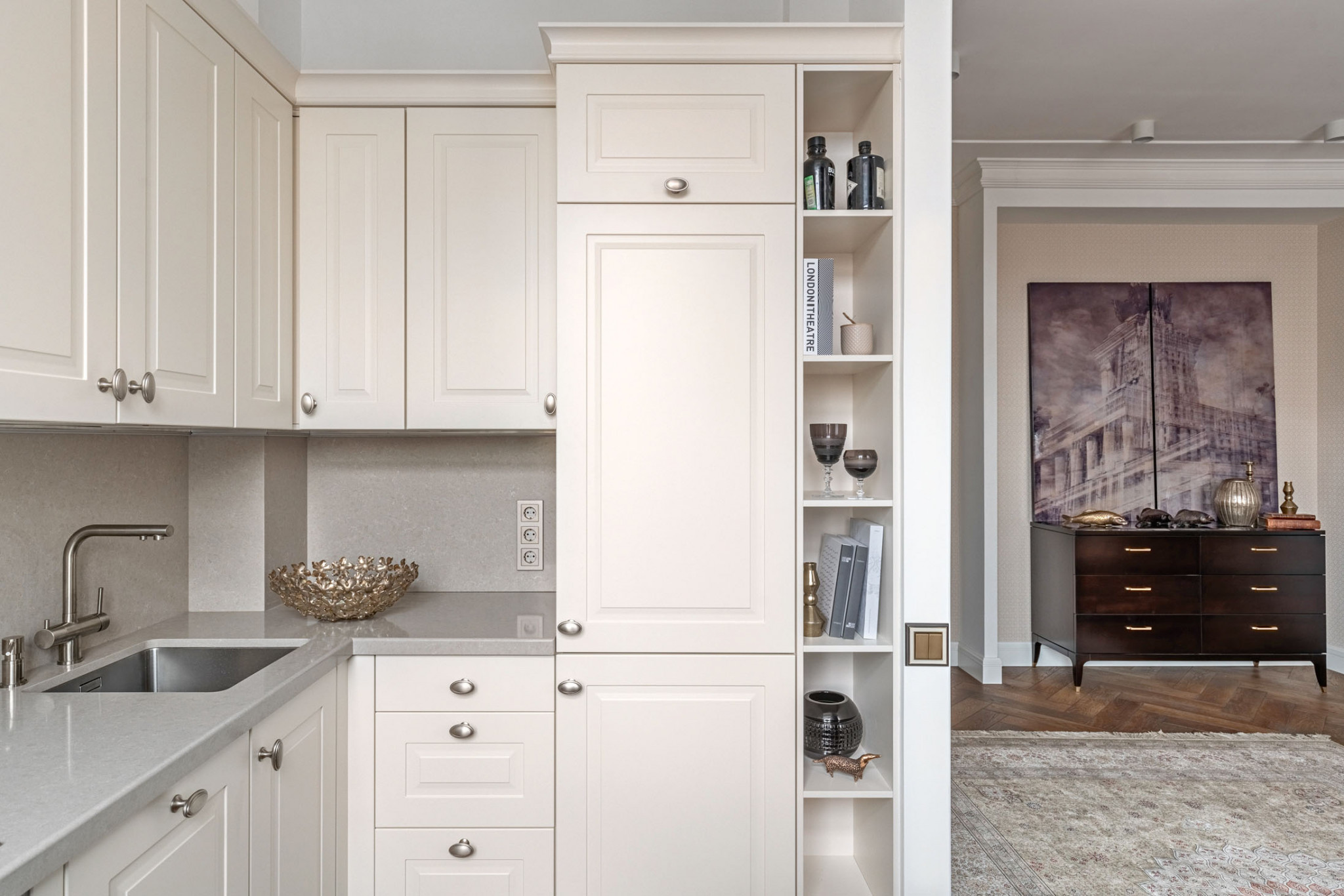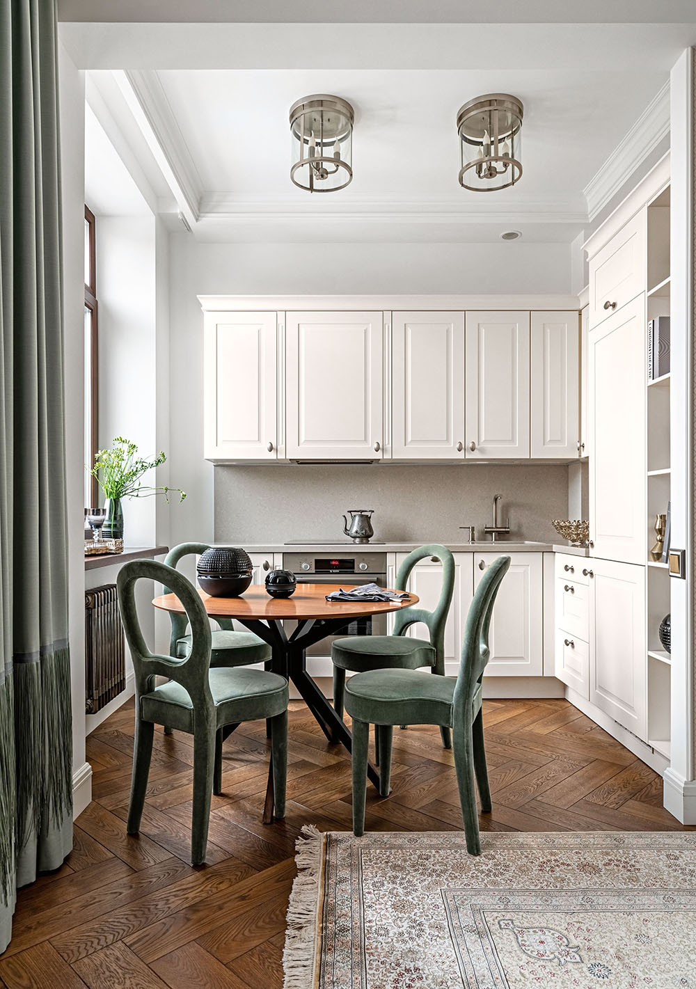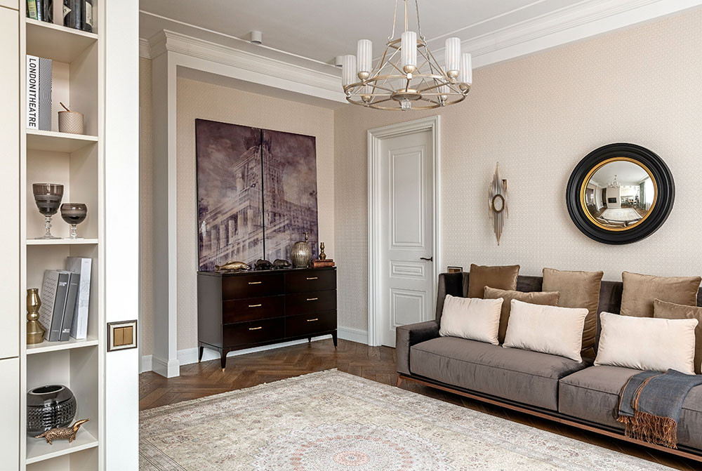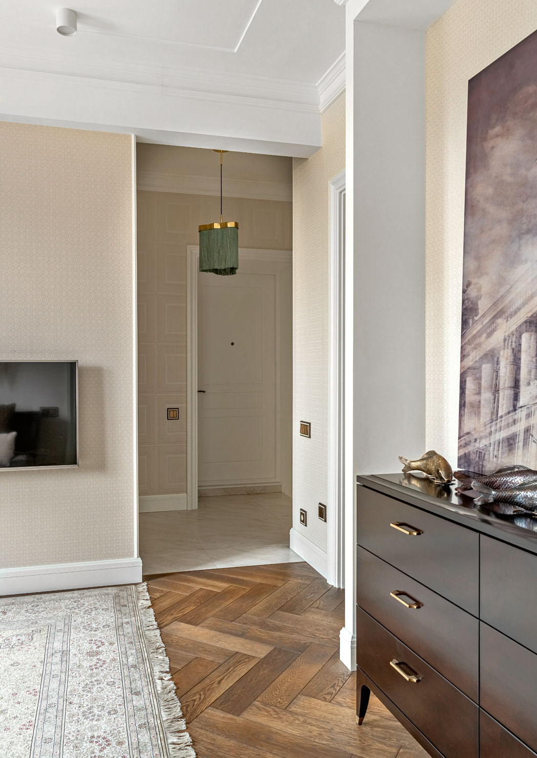 Тему ретро, навеянную местонахождением квартиры, подкрепляют элегантная цветовая палитра, мебель, двери, обои и текстиль классических очертаний или сюжетов