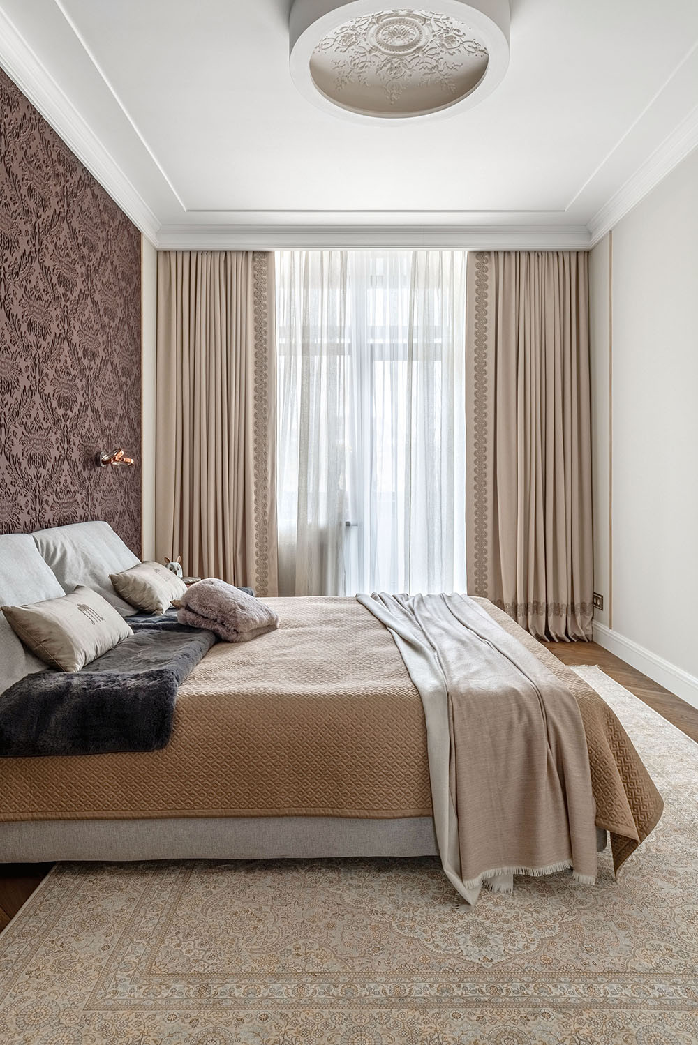 Дизайн. Атмосферу ар деко с элегантными отсылками к «сталинской классике» создают строгая планировка, сдержанная прохладная гамма с продуманными градациями оттенков коричневого, серого, песочного, дополненных вкраплениями цвета утиного яйца (сложного зелёно-голубоватого), тщательно подобранные аксессуары. Системы хранения позволяют без труда поддерживать «чистоту стиля»: в прихожей за это отвечает огромный шкаф для верхней одежды и обуви, в нём также спрятана стиральная машина. Гардеробная комната отделена от спальни занавесом на электрокарнизе. В кухне с хранением успешно справляются напольные и настенные шкафы; строгие филёнки и светлые оттенки их фасадов поддерживают впечатление простора и классической безмятежности. Привлекает внимание деликатная проработка деталей. Так, потолочная гипсовая люстра в спальне и закарнизный свет в ванной создают мягкое, рассеянное освещение, акцентные зоны выделены локальными светильниками. Дизайн портьер с интересными комбинациями шерстяных тканей, кисеи, тесьмы в технике ришелье специально создавался для этого проекта.