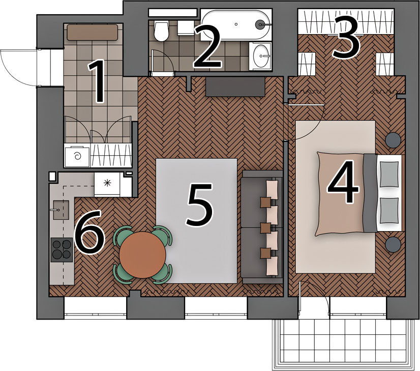 Интеллигентная супружеская пара выбрала удачно расположенное в центре города жильё с метражом, достаточным для комфортного проживания вдвоём (дети взрослые и живут отдельно). Требовались удобная спальня, функциональная современная кухня, достаточное количество мест для хранения одежды.