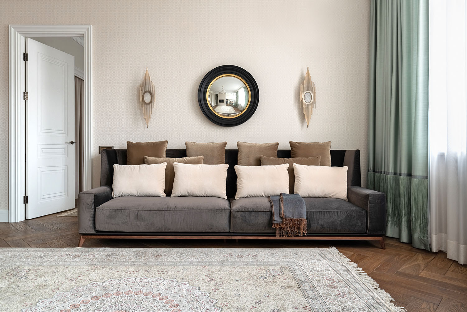 - Мебель: стулья Bilou Bilou, диван Vibieffe, стол BoConcept, зеркало Eichholtz