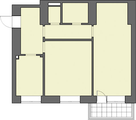Перепланировка. Перегородку, отделявшую центральную комнату от кухни и коридора, убрали, тем самым создав просторную студию. Проём между кухней и прихожей ликвидировали — это позволило скомпоновать кухонный гарнитур по наиболее функциональной Г-образной схеме. Туалет и ванную объединили. В дальнем конце спальни, за шторой, оборудовали гардеробную. Дань стилистике «сталинки» — устроенная в глубине студии и оформленная как нарядный портал неглубокая ниша.