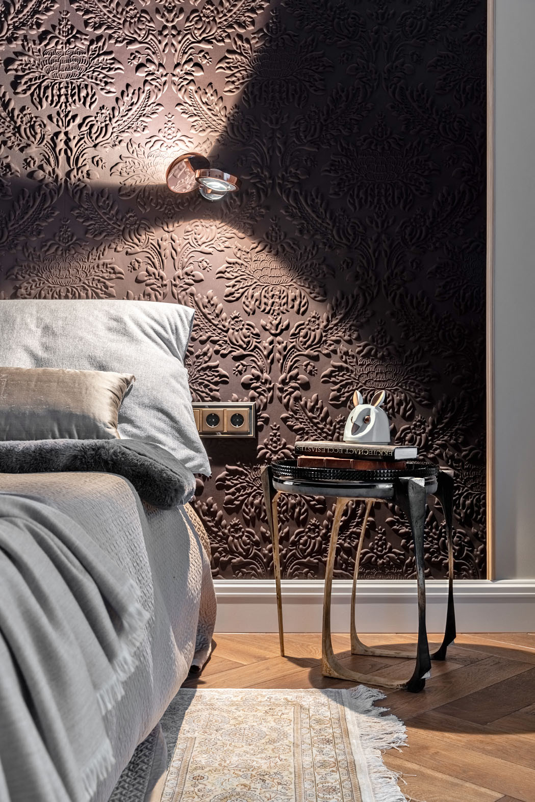 Шарм в интерьерах создают дизайнерские обои — с рельефным узором за изголовьем кровати, структурным рисунком в прихожей, шелковистой фактурой хлопка и льна в жилых комнатах
