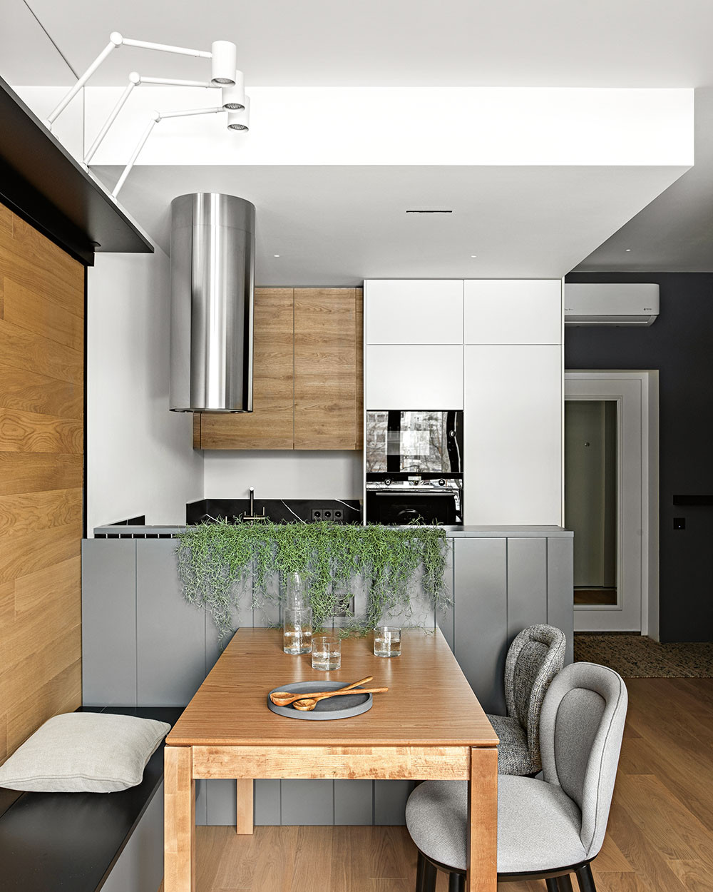 Пандемия многих заставила пересмотреть условия жизни и работы. В этой квартире обстановка создавалась с учётом работы из дома. Хозяин — будущий психолог. Ему требовался позитивный фон для видеоконсультаций — стена в отделке деревом — плюс отличная звукоизоляция. Ведь он ещё и музыкант. В остальном интерьер небольшой квартиры, где живут молодой человек и его девушка, демонстрирует лаконичность и грамотное зонирование.